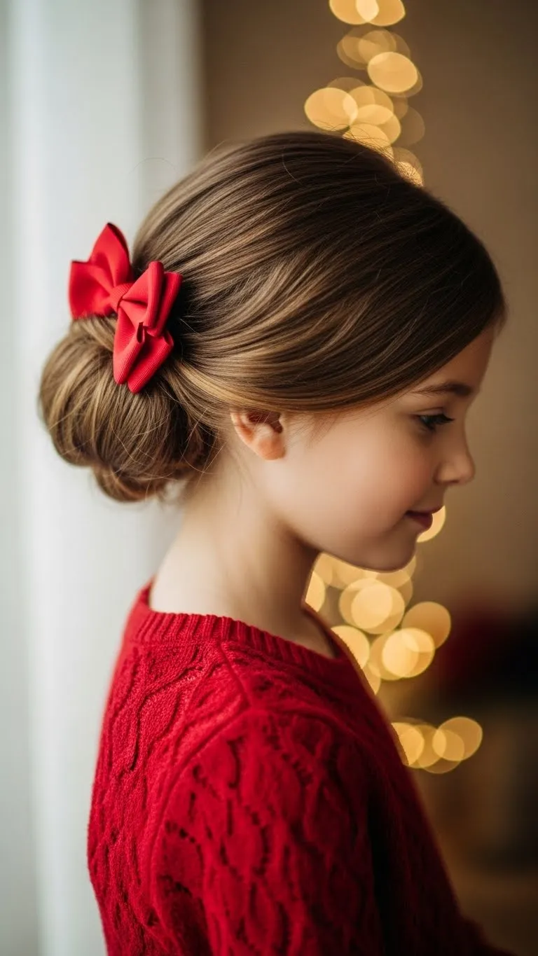 Make a loose low bun and add a bow. Leave it soft and slightly messy. Works for medium to long hair. If pieces fall, let them—they add charm. Perfect for quiet family dinners or pictures.