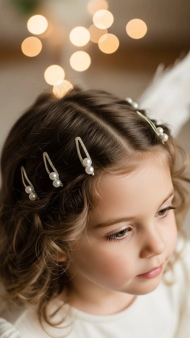 Scatter tiny pearl clips throughout the hair for gentle sparkle. Use lightweight clips. Works well on curls or straight hair. Keep the rest of the styling simple. Ideal for holiday portraits.