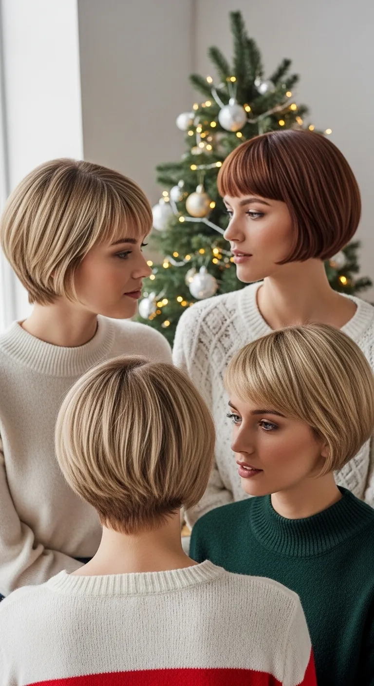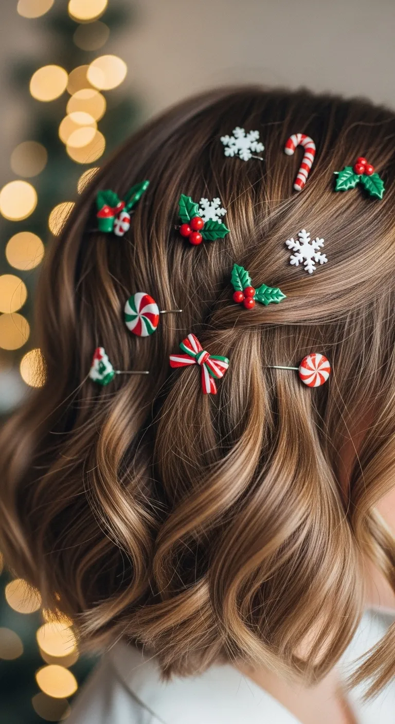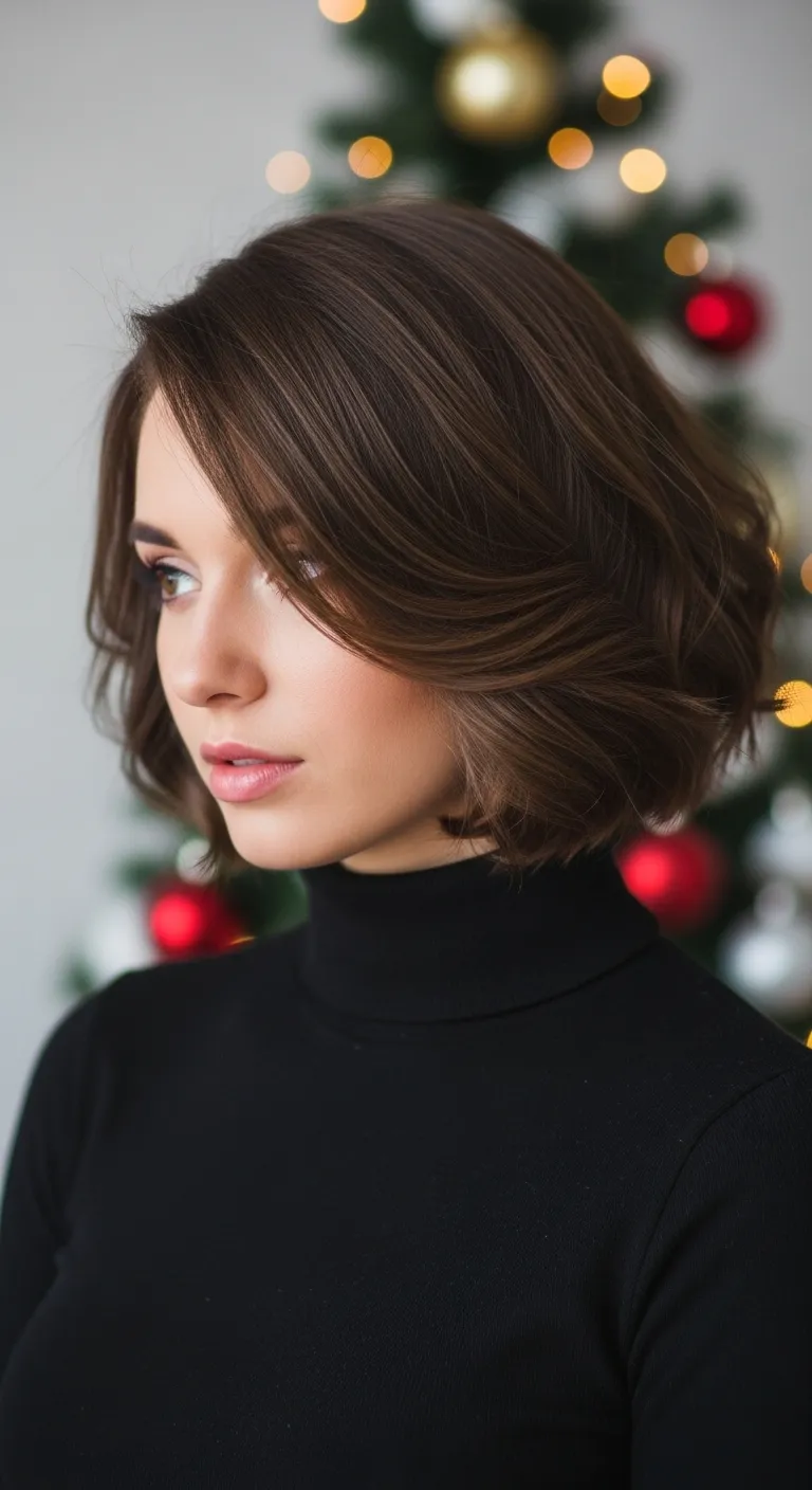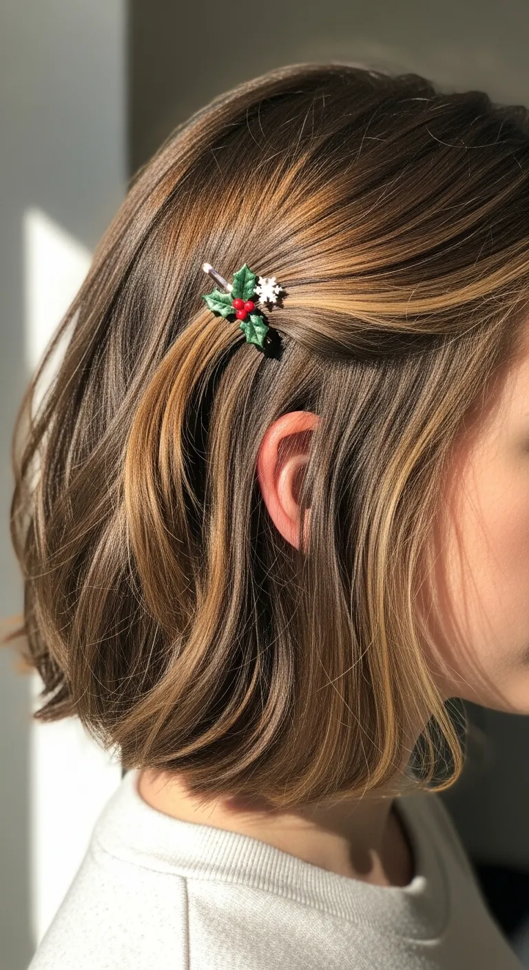 A soft wavy bob always looks pretty in Christmas photos. You can create loose waves with a simple flat iron by bending sections slightly instead of curling tightly. Use a lightweight cream to keep the texture airy. Add two or three small metallic pins to one side for a festive touch. You can find inexpensive packs online or at local stores. If your hair feels fine, tease the crown lightly for height. Keep the waves soft so the style appears relaxed and natural. This look works well if you want something quick but polished.