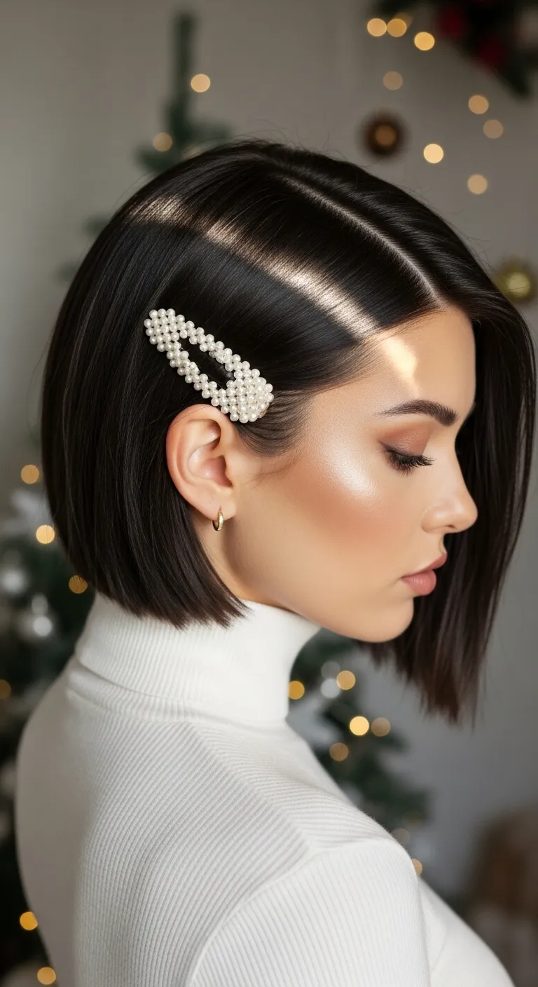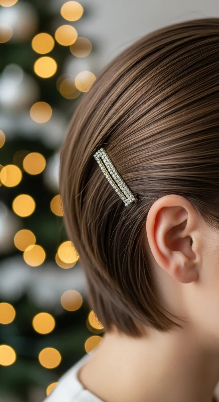 A deep side part gives a clean shape that looks great on camera. Smooth your hair with a flat iron and brush it through with a little serum for shine. Add a pearl clip to the heavier side of the part for a festive accent. You don’t need anything expensive; even a budget clip looks pretty with sleek hair. If your roots puff up, press them gently with the iron. Keep the ends tucked inward for a softer frame.