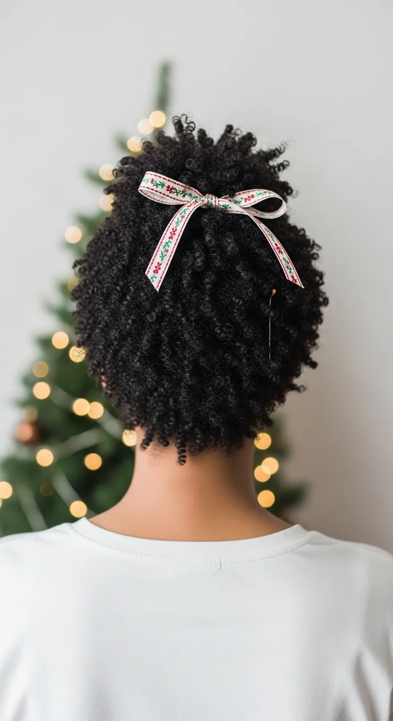 A micro puff looks adorable on coily hair. Gather the top section into a small puff and tie it with a thin holiday ribbon. Pick satin if you want shine. Moisturize your curls first so they stay soft. Stretch the puff gently to shape it. This idea is cheap, easy, and perfect for quick photos. If the ribbon slips, anchor it with two pins underneath.