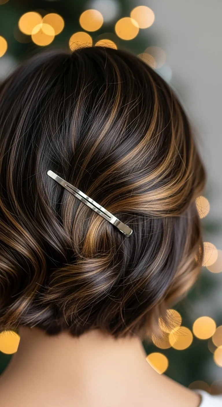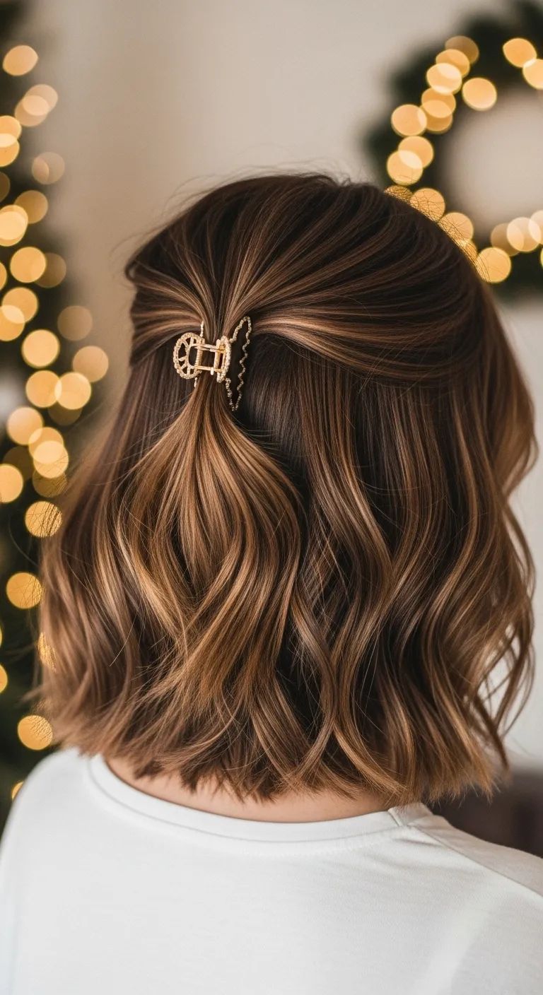 Mini claw clips are perfect for short layers. Create loose waves, gather a small section at the crown, and clip it back with a tiny claw. This lifts the top slightly for shape. Pick a clip in gold, red, or pearl tones for Christmas. You can find packs for cheap online. Spray the waves lightly so they stay soft. The style works well for both casual and dressy outfits.