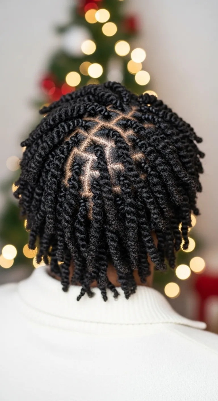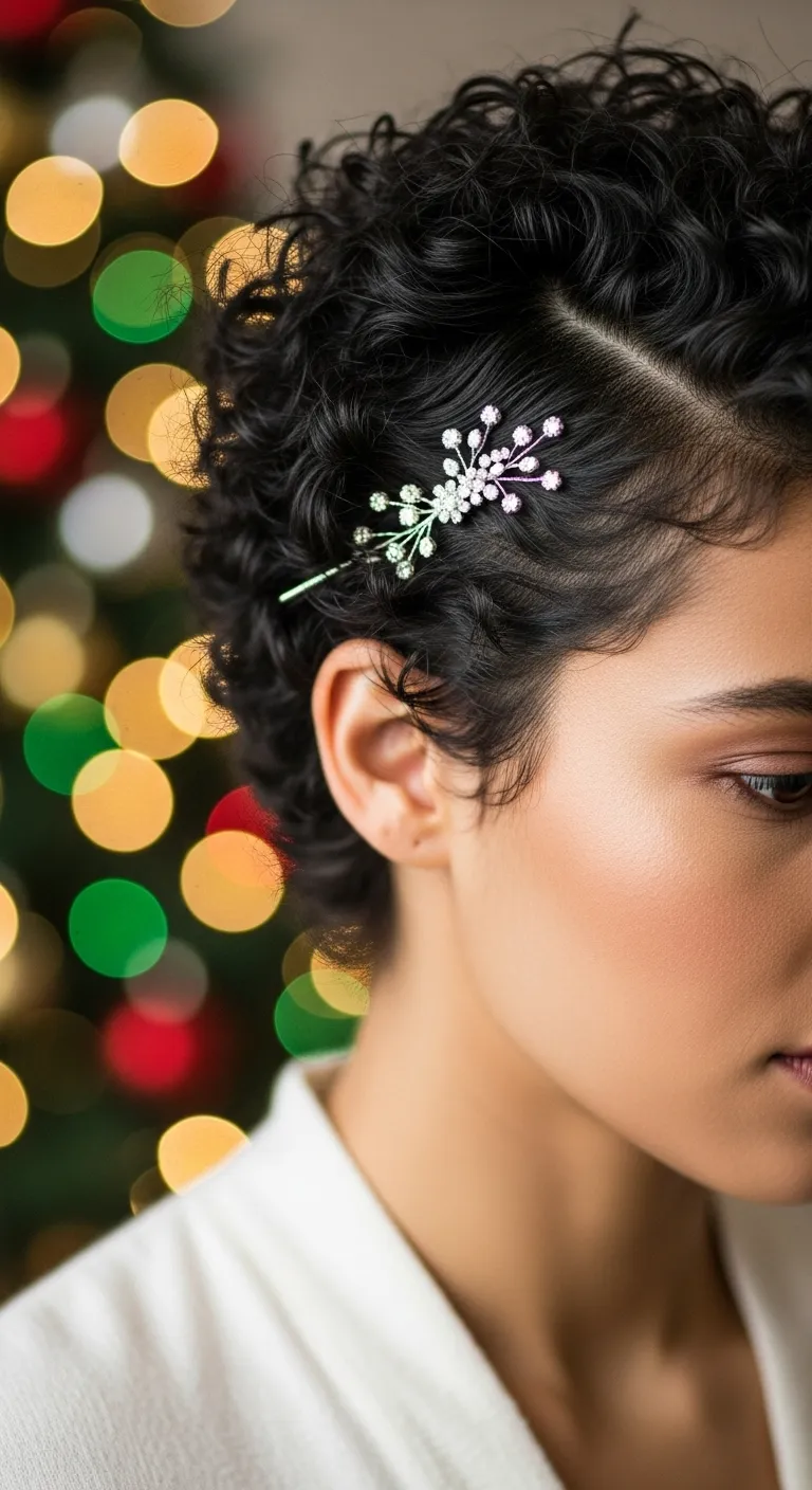 Short coils look amazing in close-up photos. Part your hair to one side and add a sparkle pin near the temple. Use a curl cream to define the coils and fluff them lightly for volume. If your coils shrink too much, twist a few sections before drying. The sparkle pin adds just enough shine for Christmas pictures. Keep the style soft so the shape stays natural.
