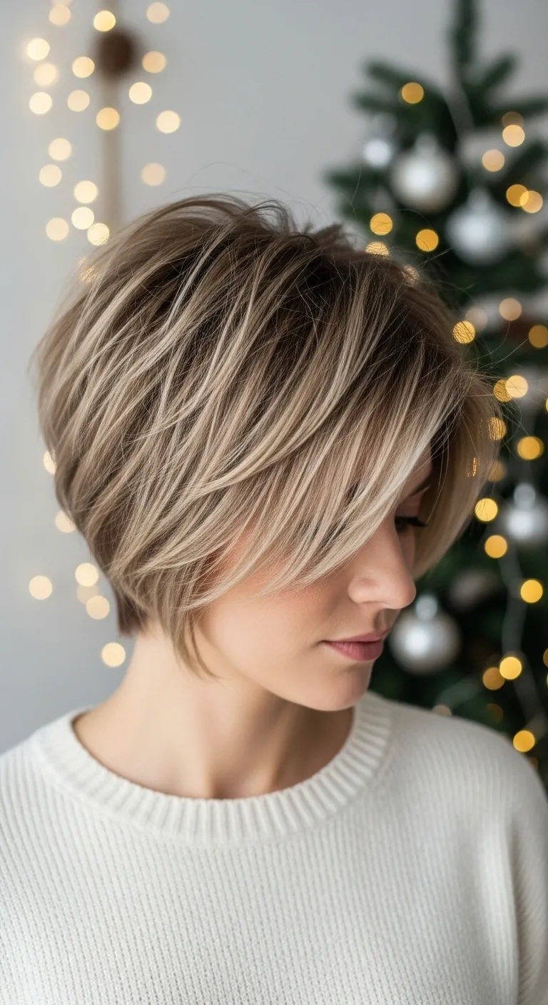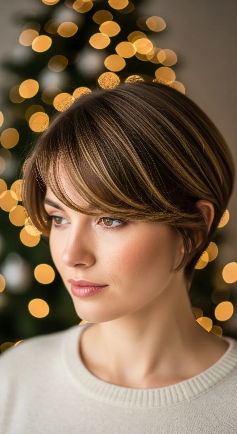 Soft fringe frames your face gently and looks lovely in holiday photos. Smooth the fringe with a flat iron, then sweep it slightly to one side. Use a touch of serum for shine. Keep the rest of your pixie textured for balance. Add a small holiday accessory if you want. This style works with casual sweaters and dressy outfits alike.