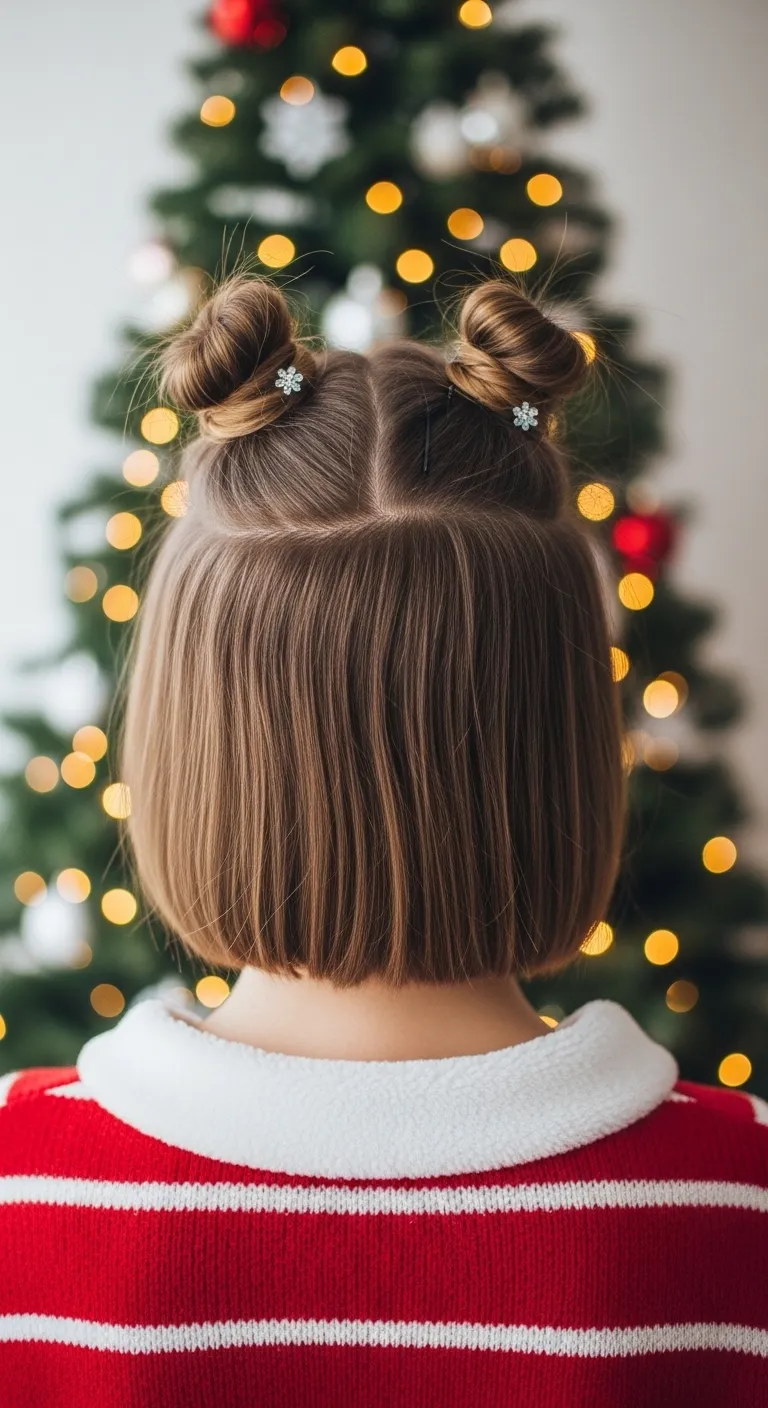 Tiny space buns add a playful touch to Christmas outfits. Part your hair down the center, gather two small sections, and twist them into buns. Pin them tightly so they stay put. Add sparkle pins if you want extra shine. If your hair is layered, let shorter pieces fall out naturally for a cute touch. This style suits casual gatherings and fun photoshoots.