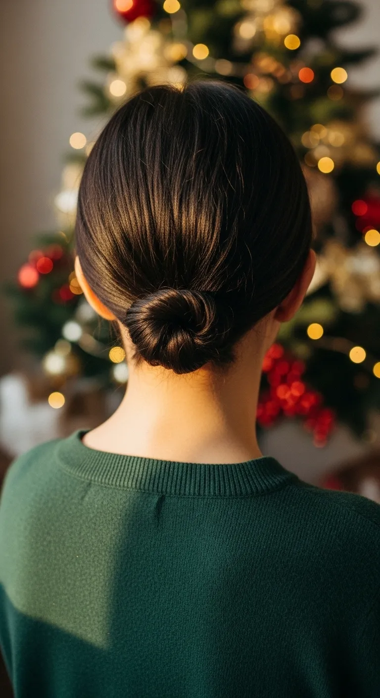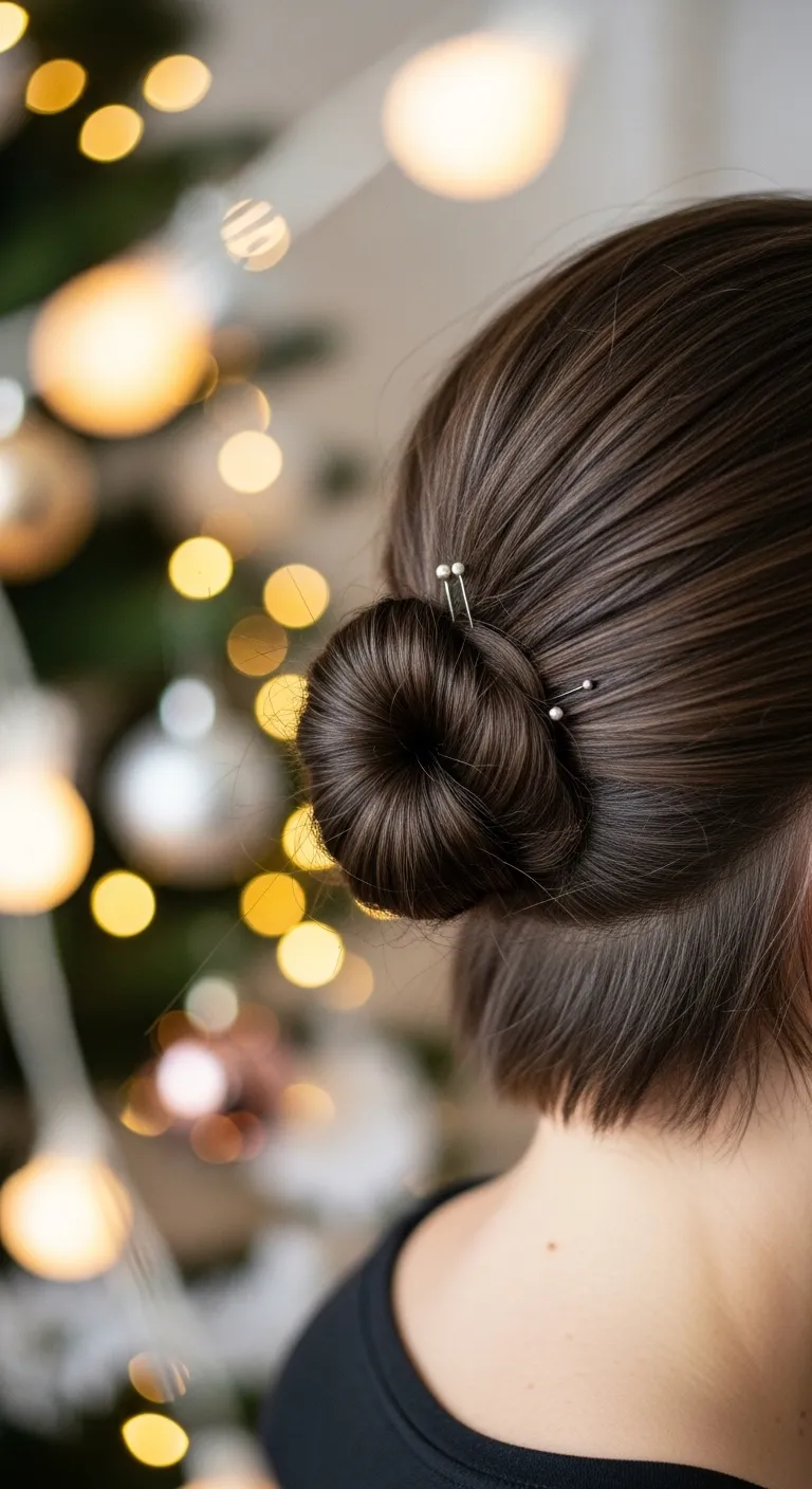 A low twisted style at the nape works well when you want something tidy but still soft. Gather the lower half of your hair and twist it inward, securing it with hidden pins. The rest of your hair can stay natural. This look especially suits chin-length cuts. Use hairspray lightly so it stays neat without feeling stiff. Add a small gold pin near the twist for a holiday hint. It’s an easy, camera-friendly choice.