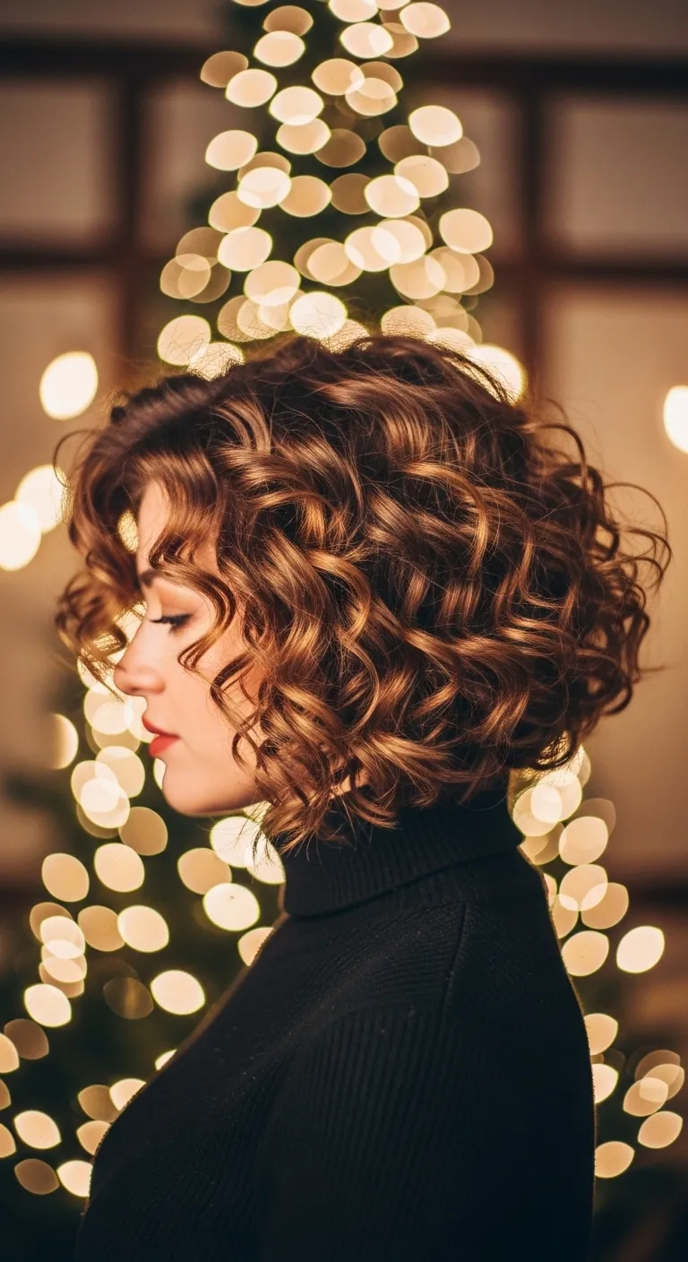 A curly bob stands out when one side has extra lift. Use a diffuser to dry upward for volume. Pick a small festive clip for the flatter side so the shape looks intentional. Define a few curls with your fingers for a photo-ready look. If your curls shrink unevenly, twist a couple and stretch them while drying. This style looks soft and balanced.