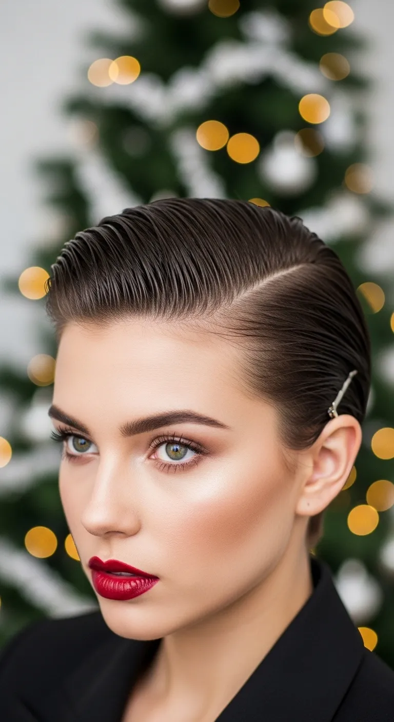 The wet-look pixie works well for dramatic Christmas photos. Apply gel evenly and comb your hair back or to the side. Keep the finish smooth. Use a blow-dryer on low to help set it without losing shine. Pair it with a bold lip for contrast. You can finish with a small clip if you want a holiday touch. This style is cheap, quick, and modern.