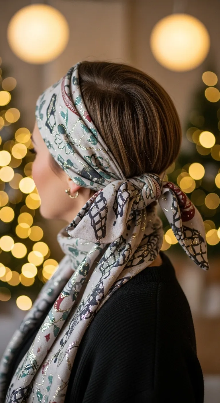 A scarf adds color and charm to short hair. Fold it into a thin band and tie it at the nape or top. Pick holiday shades like burgundy or emerald. Leave the rest of your hair natural or add light waves. This works well when you’re short on time or want to match your outfit. It’s also a cheap styling option that photographs beautifully.