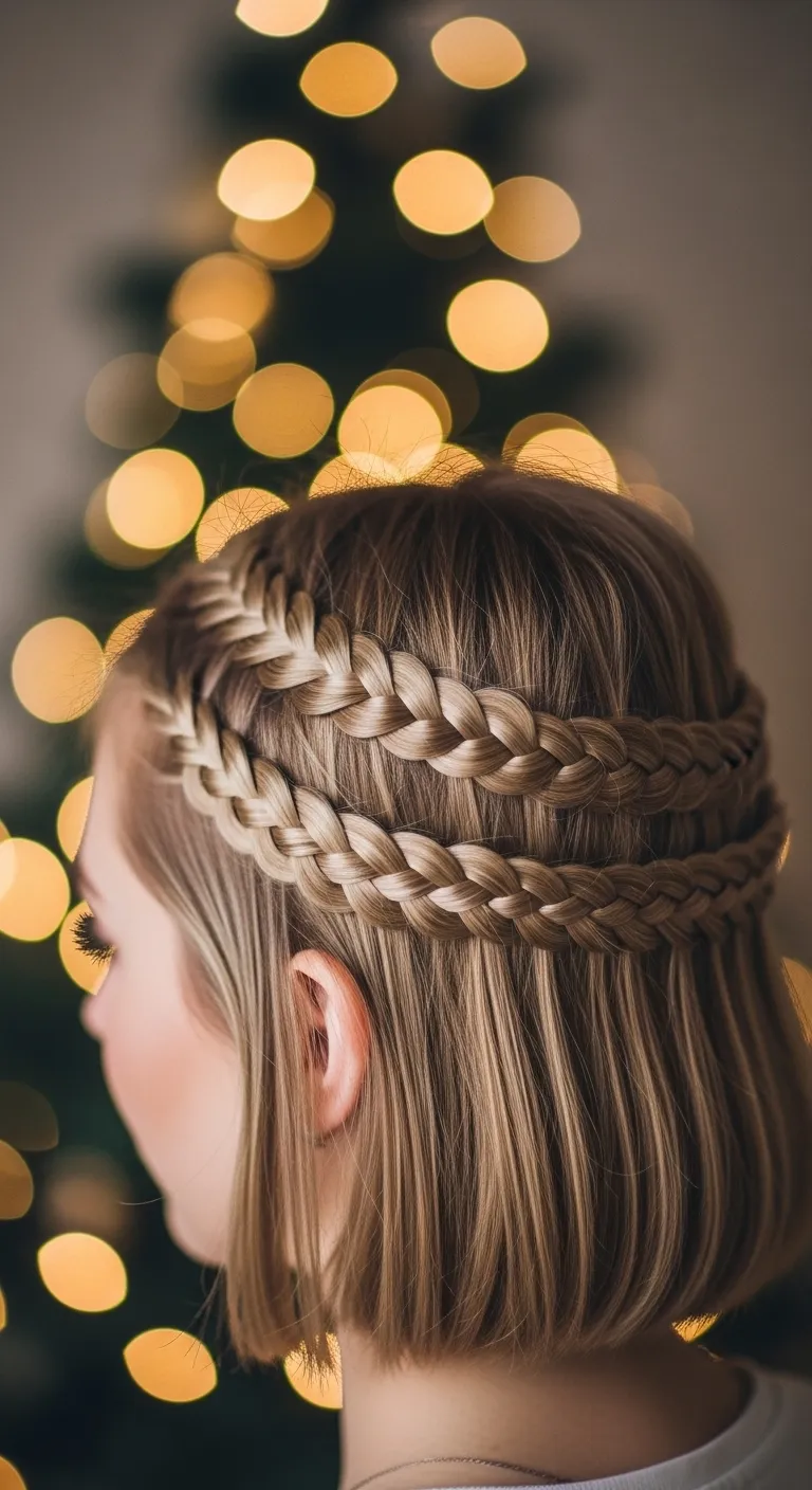 A mini braided crown looks sweet for Christmas photos and works even on short lengths. Create two tiny braids from each temple and pin them across the top of your head. Tug the braids slightly to widen them for a fuller look. Use bobby pins that match your hair color so they disappear. Add a dab of pomade to smooth flyaways. If your hair is layered, clip the shorter pieces underneath. The style takes only minutes but looks detailed.