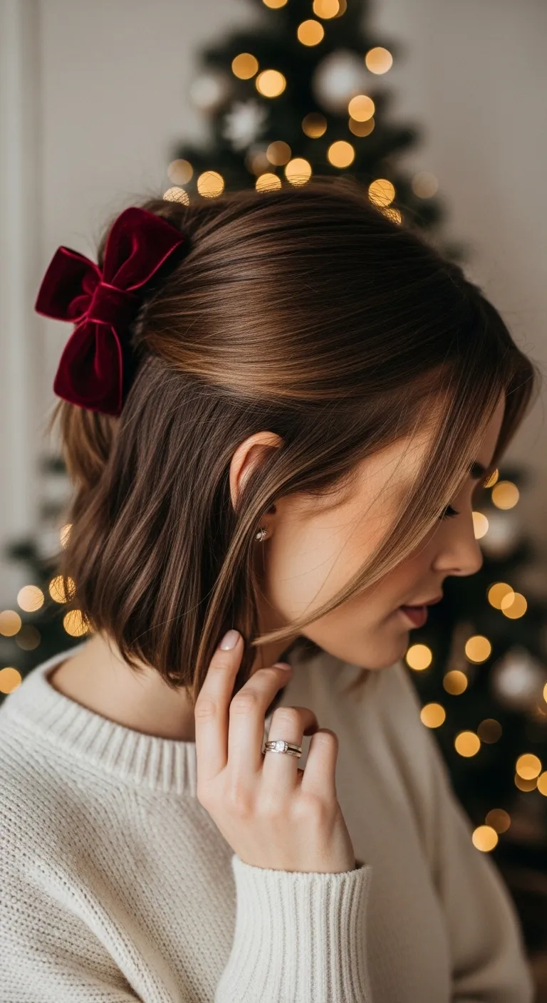 The half-up look is simple and cute. Pull the top section of your hair back and secure it with a velvet bow clip. Pick a shade that matches your outfit so the whole look feels intentional. A small curling iron can add soft bends to the loose pieces. If your clip feels heavy, anchor it with two bobby pins crossed underneath. This is perfect when you want something festive without extra work.