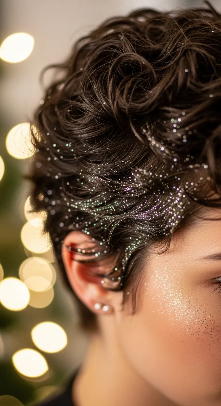 A curly pixie already looks lively, and adding a tiny bit of glitter gel near the hairline gives it holiday sparkle. Use only a fingertip amount so it doesn’t look heavy. Scrunch your curls with a moisturizing cream to keep them soft. If your curls shrink, stretch them gently while diffusing. You can pick gold, silver, or copper glitter depending on your outfit. The result photographs beautifully without needing long prep time.