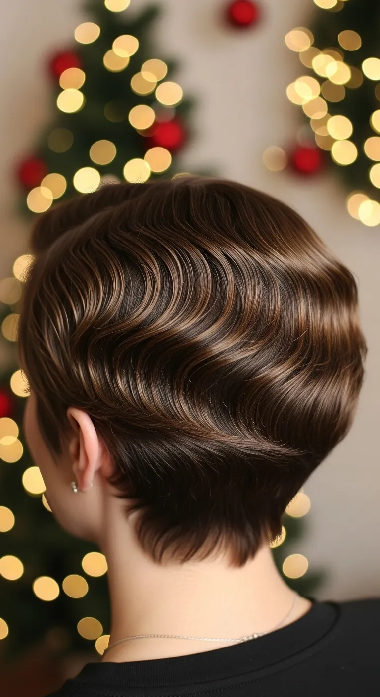 Retro waves bring a classic vibe that suits Christmas parties. Use a comb and a bit of gel to shape “S” waves along the sides. Keep the top smoother to hold the pattern. This style works on straight or slightly wavy hair. You can also create a faux wave by clamping the hair with a flat iron in soft bends. Add a simple clip near the ear for a festive accent. It looks detailed but stays budget-friendly.