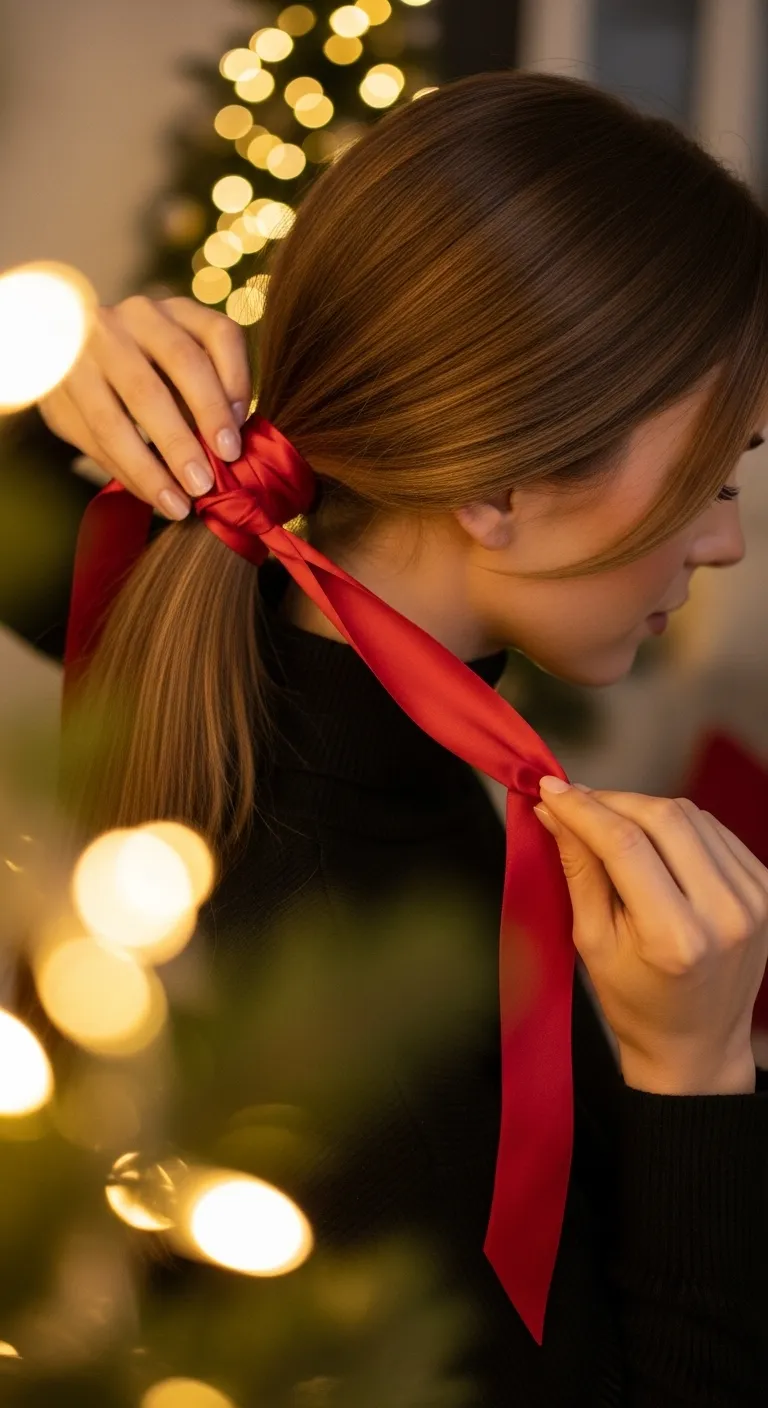A soft low pony works well when you want quick polish. Brush your hair back, gather it at the nape, and tie it with a simple elastic. Leave a few loose strands near the face for a relaxed finish. Wrap a thin satin ribbon around the base and tie a neat bow. Choose red, green, gold, or any shade that matches your outfit. This costs almost nothing and adds instant charm. If your hair tends to slip, lightly mist with hairspray before tying it. You can also tug gently at the crown to add small pockets of volume. This style photographs well from every angle and stays put during long evenings. It’s perfect for work parties or family photos when you want something simple but pretty.