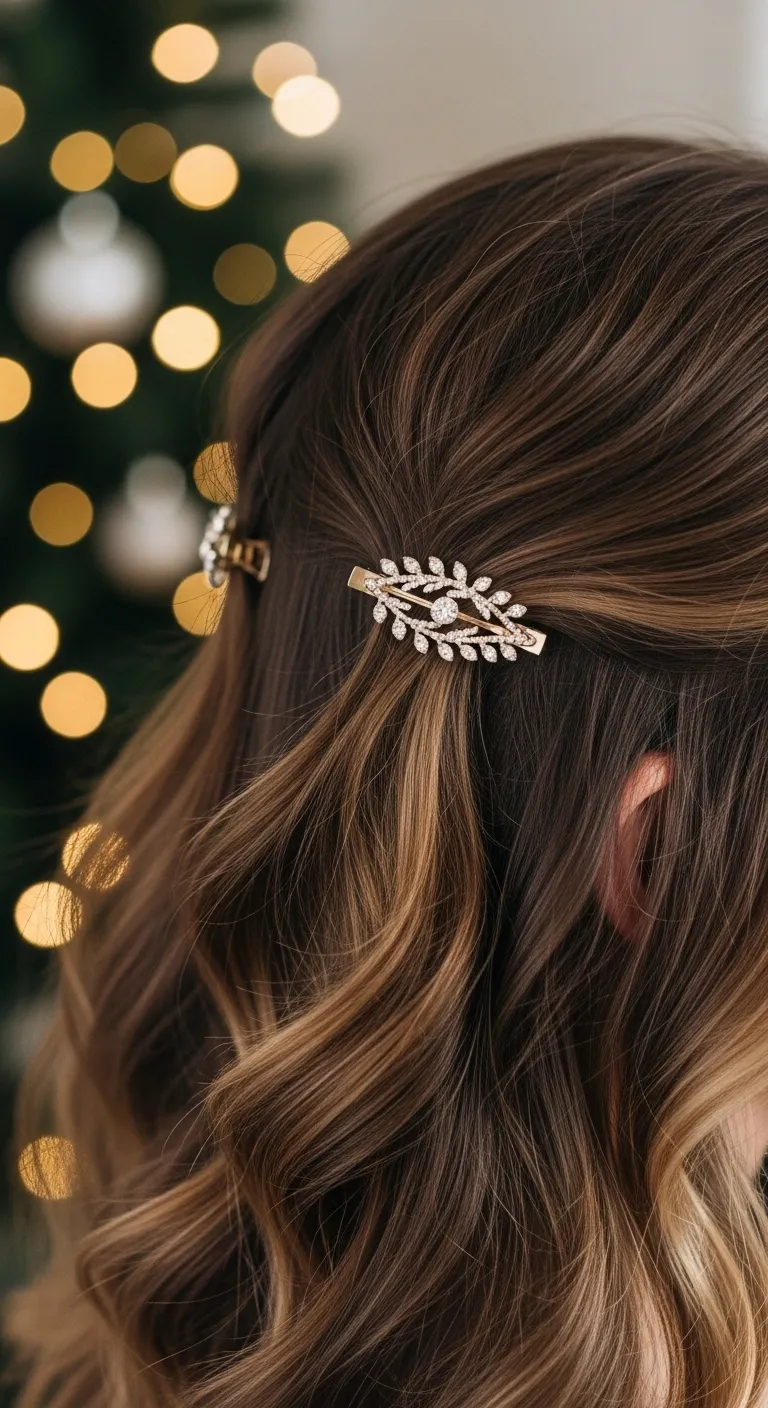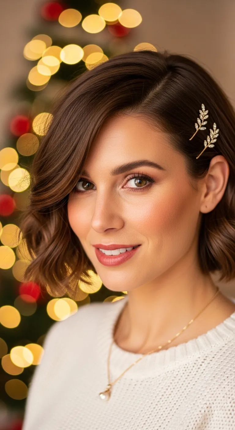 Short hair can look festive with just a couple of pins. Sweep one side behind your ear and place two clips diagonally. Choose pearl, gold, or glitter styles for a seasonal feel. This takes seconds and works on all short cuts—bob, lob, or pixie. If your hair slips, use a bit of dry shampoo to add grip. This look fits well with winter outfits and shows off earrings nicely.
