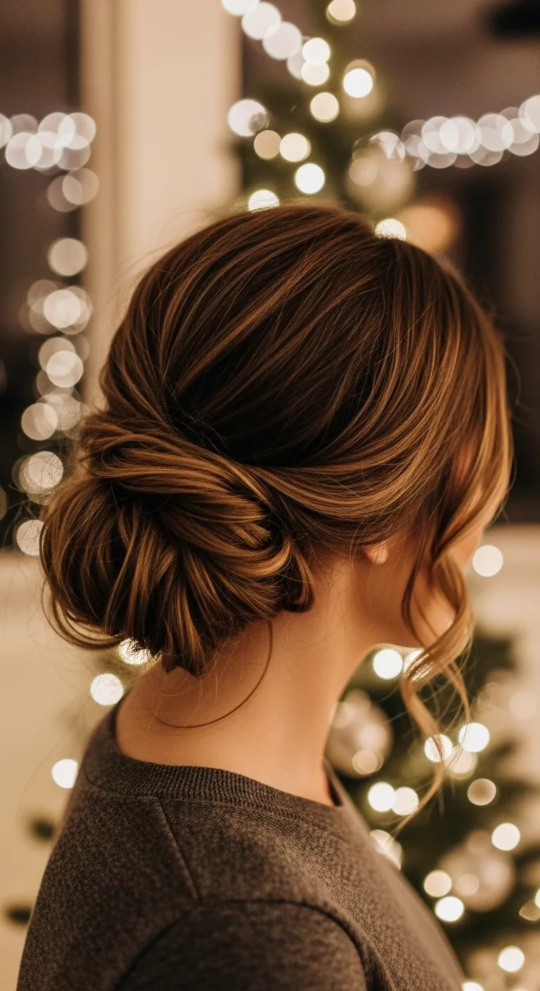 A textured low puff works beautifully when you want something easy and soft. Add a bit of curl or bend to the ends if you want shape. Gather your hair low at the nape and secure it loosely. Pull a few strands to create fullness. Add a small clip or ribbon to match the season. This style stays comfortable and works on many hair types. It takes only minutes and still gives a warm holiday feel.
