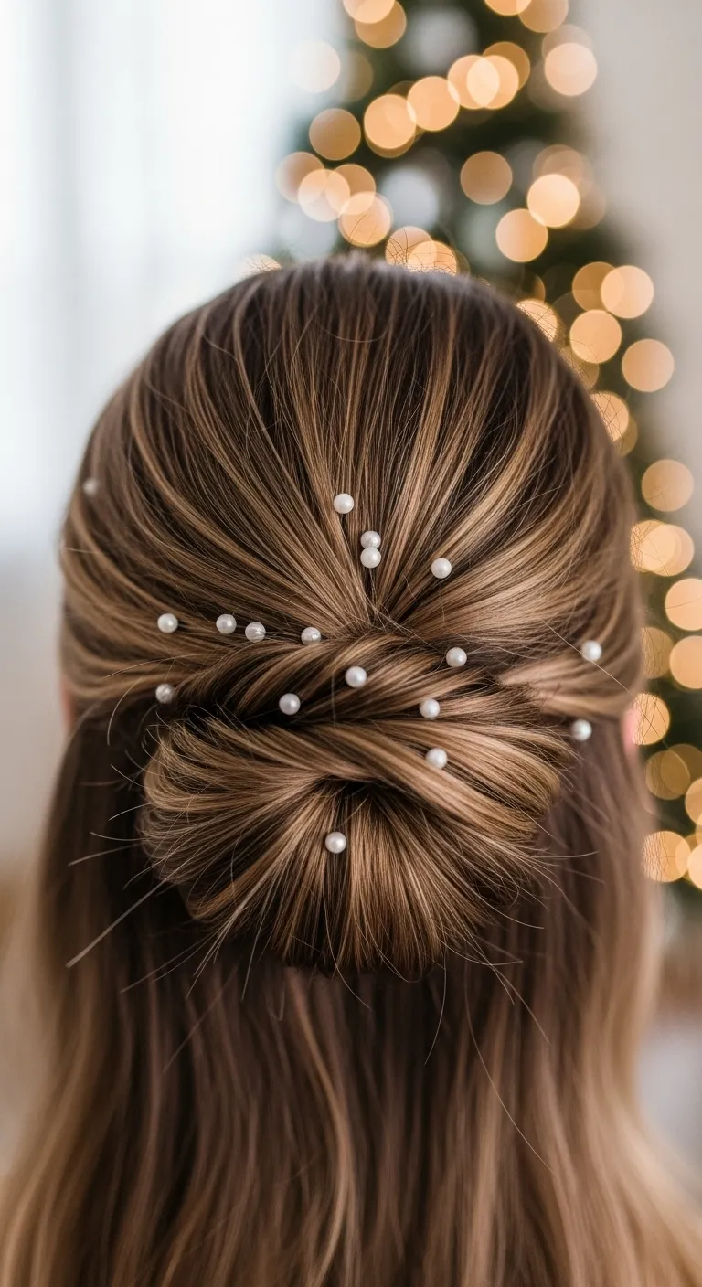 A twisted half-up style becomes a holiday favorite with tiny pearls. Twist two small sections from the sides and secure them at the back. Slide in a few pearl pins where the twists meet. You only need three or four for a nice effect. These pins are cheap and last for years. This style works on straight, wavy, or curled hair. For more shape, curl just the ends. It’s great for dinners or gift gatherings because it stays neat without feeling tight. The pearls add a soft shine that looks pretty in photos and warm lighting.