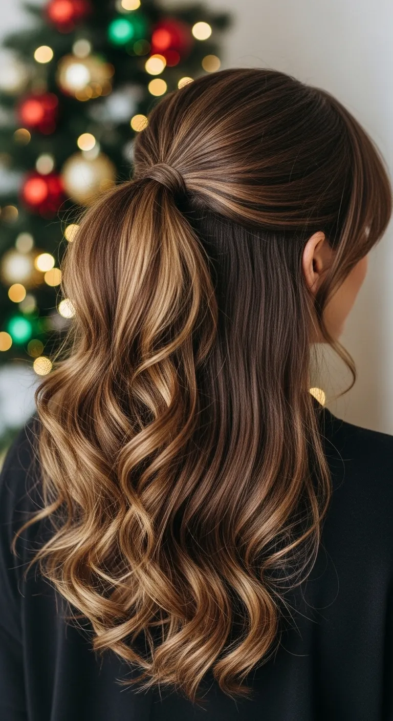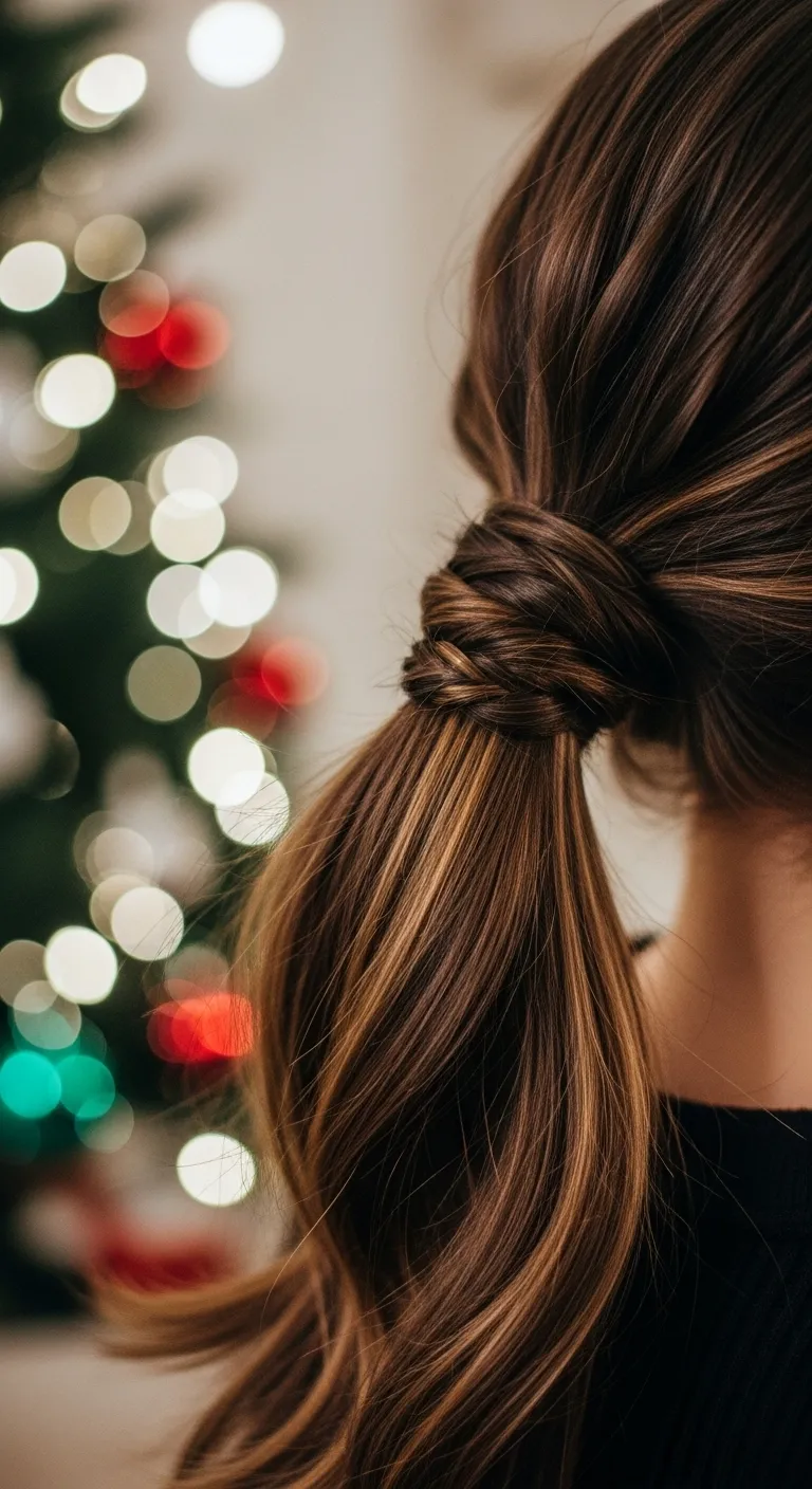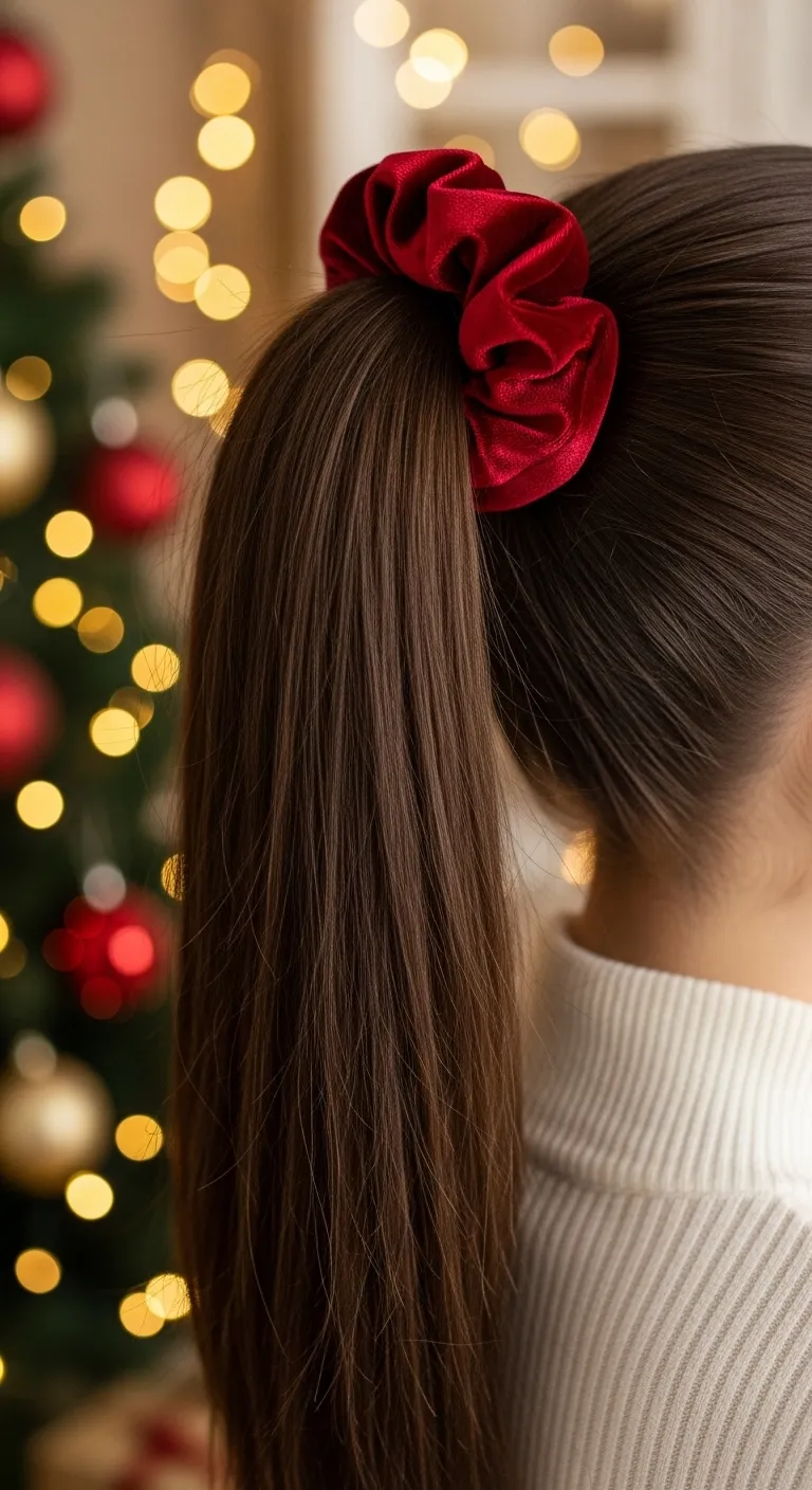 A high pony with a velvet scrunchie gives a cheerful holiday feel with almost no effort. Pull your hair up, smooth the sides with a brush, and tie it high. Use a velvet scrunchie in red, green, or burgundy to add a small seasonal accent. Velvet grips well, so it holds the pony without pulling your hair. If you want extra lift, flip your head forward when gathering the pony. You can curl just the ends for movement. This style is fast, affordable, and great for busy days when you want something simple but cute. It also works well for gatherings, shopping trips, or casual hangouts.