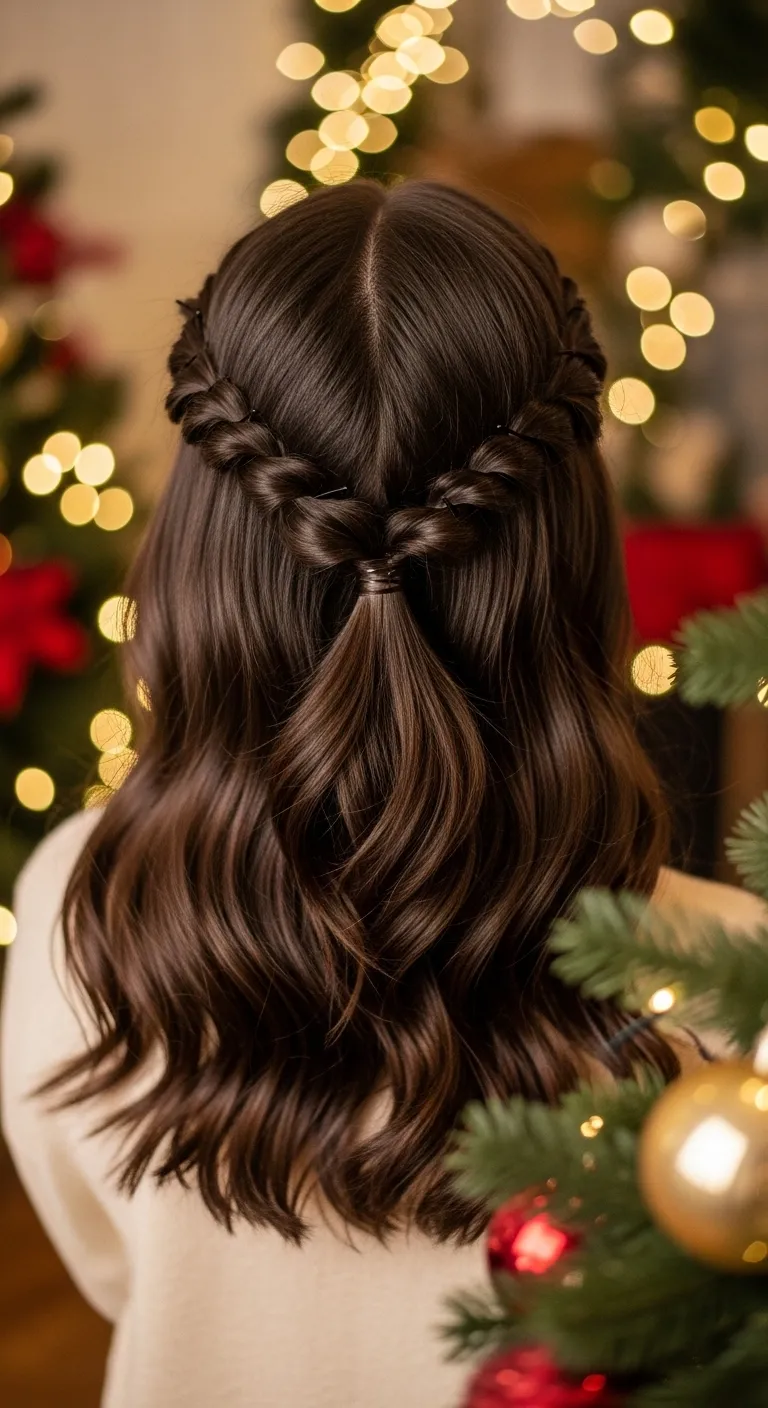 A double twist half-up works well when you want volume at the crown. Take small sections above your ears, twist each upward slightly, and pin them at the back. Lift the top section gently with your fingers to create height. This takes less than five minutes and needs no heat. If you want something festive, add a small bow clip where the twists meet. It’s inexpensive and adds charm. This style works for all hair lengths past the chin. It stays comfortable all day and pairs easily with winter outfits.