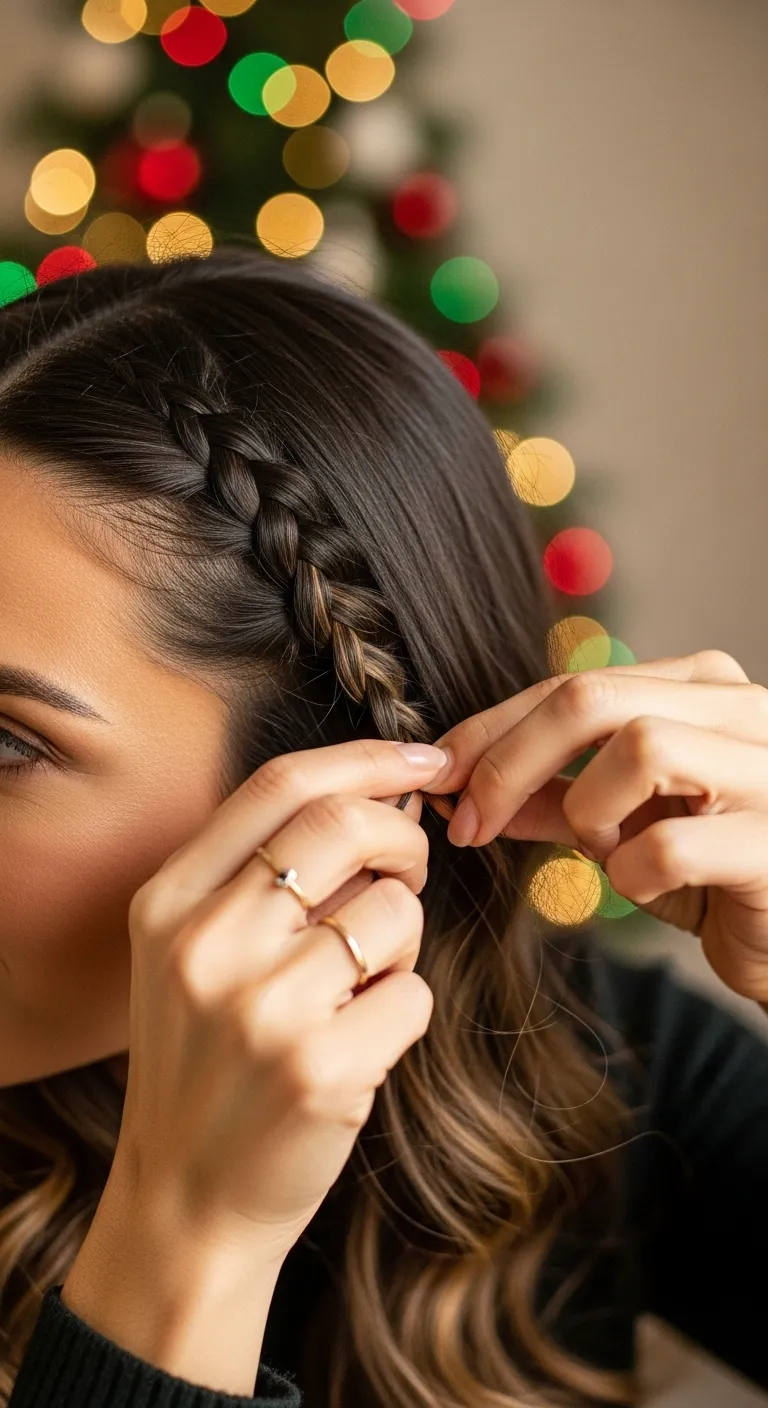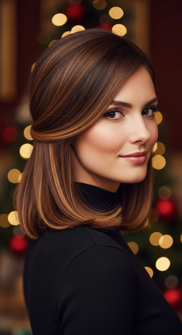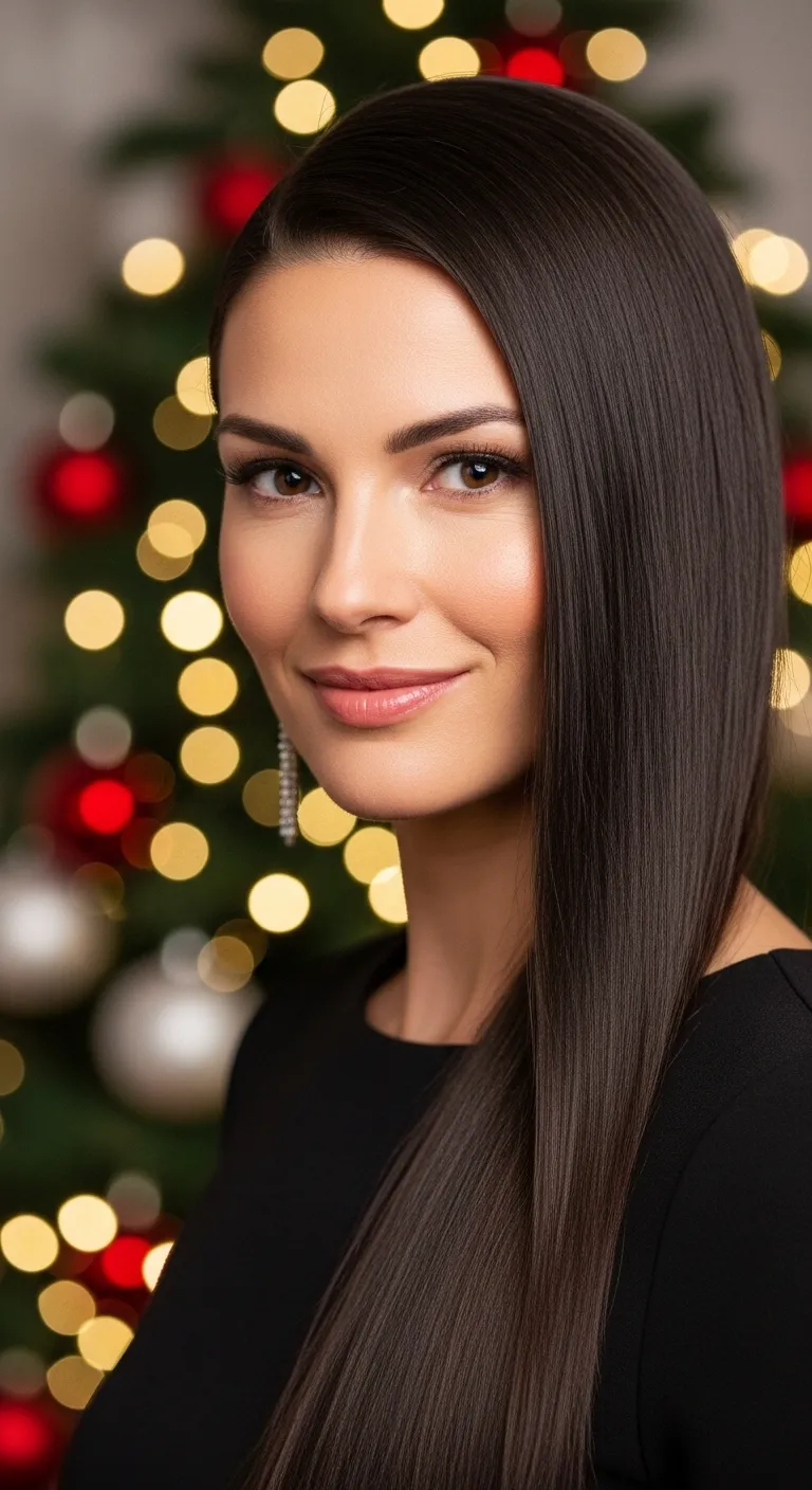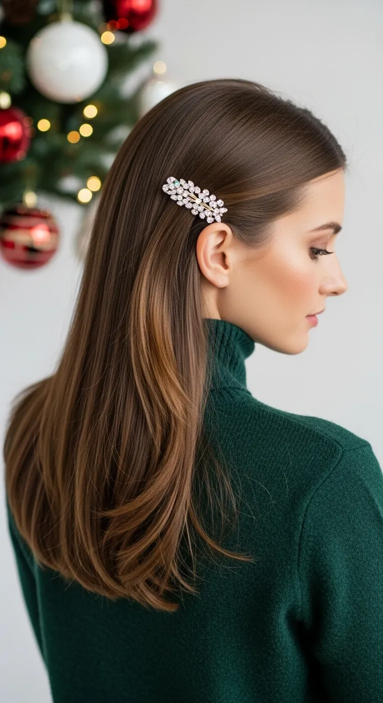 When you want a simple style that always looks put-together, try a sleek side part. Brush your hair straight, smooth it with a flat iron if you like, and shift your part slightly deeper to one side. This small change adds Christmas-ready drama without extra effort. Use a tiny bit of serum on the ends to reduce flyaways. If you want a quick accent, slide in a thin metallic barrette above your ear. You don’t need expensive products—one small serum bottle lasts weeks. This works well for dinners and winter outings because it stays neat, even in light humidity. It also pairs nicely with bold earrings or red lipstick.