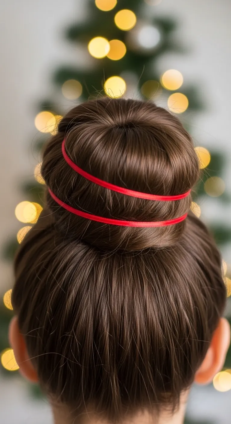 A ribbon-wrapped high bun adds quick charm with very little effort. Pull your hair into a high pony, twist it into a bun, and secure it with pins. Take a thin ribbon and wrap it lightly around the bun. Tie the end or tuck it underneath. You can choose any color that matches your outfit. This style works well when you want height and a simple festive accent. If your hair is fine, tease the pony a bit before forming the bun. If it’s thick, keep the twist loose so the bun doesn’t look too heavy. This bun stays secure and looks polished for photos, dinners, and gift exchanges.