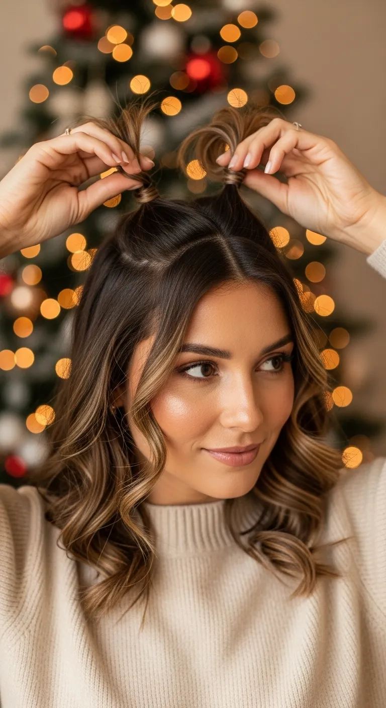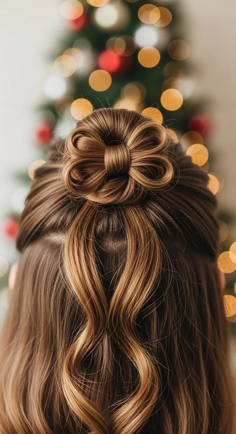 A half-up bow bun looks cute and festive without taking too long. Gather a small top section of your hair and tie it into a half pony. Split the pony in half and loop each side to form the shape of a bow. Pin both loops tightly. Use the small leftover strand to wrap the center. This creates a bow made entirely from hair. It looks more complex than it is. It takes only a few minutes once you get the hang of it. You don’t need much—just a few pins. This style works best on medium to long hair and pairs well with Christmas dresses, sweaters, and scarves.