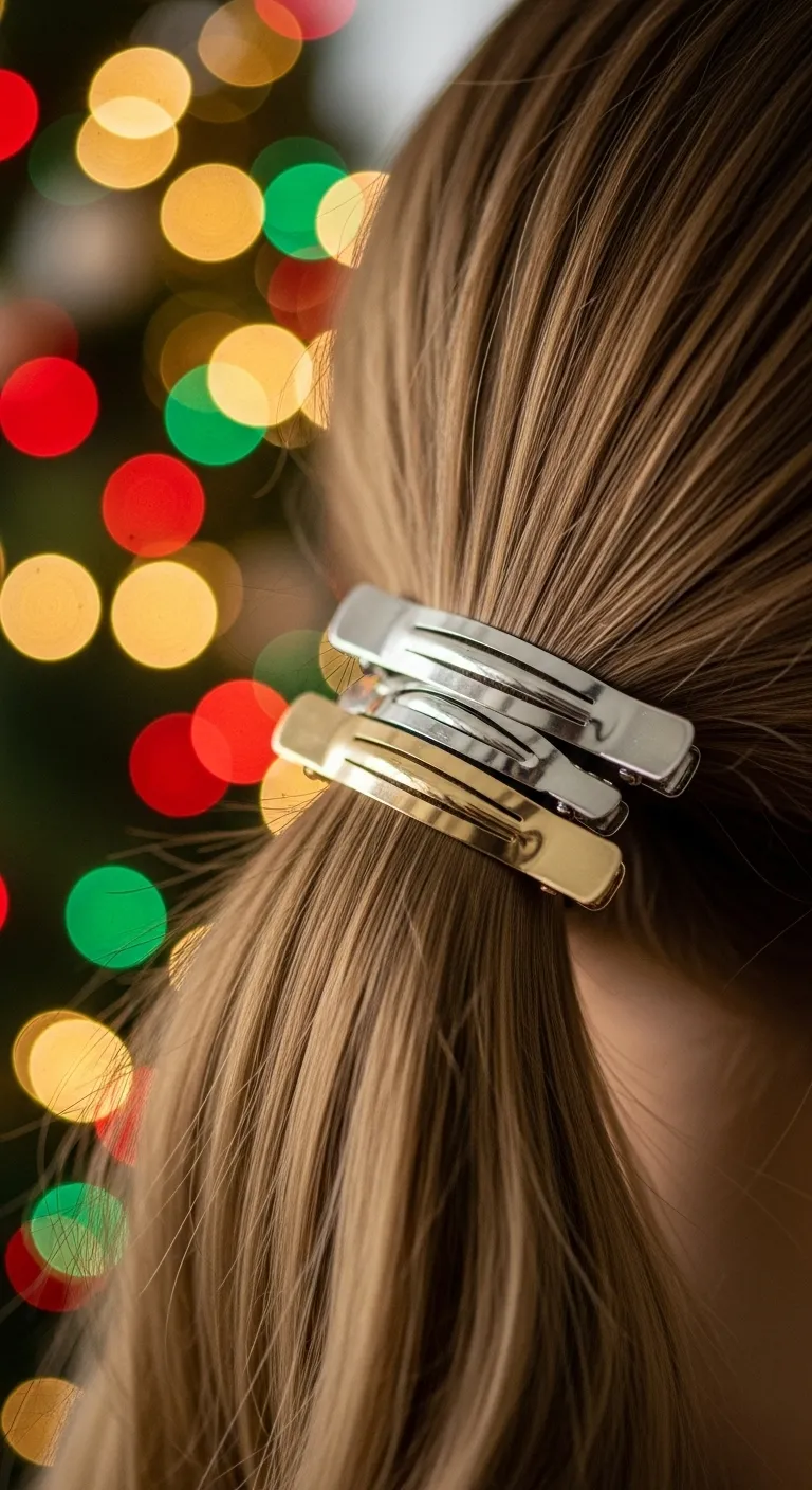 A barrette stack gives a low pony a quick upgrade. Pull your hair into a low pony at the nape. Then place two or three small barrettes above the elastic. Mix metallic, pearl, or glitter styles for a festive touch. These can be found cheaply and reused for other outfits. This style takes almost no time and works with any texture. You can straighten your hair or leave it natural. It also holds up well through a full evening of activities.