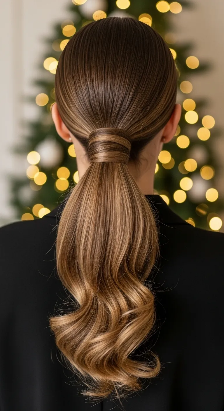 A wrapped pony gives a clean finish with little effort. Pull your hair into a mid pony, take a small strand from underneath, and wrap it around the elastic. Pin the end underneath. Curl the ponytail ends lightly for movement. This style takes only a few minutes and works on medium or long hair. You can add a thin ribbon under the wrapped piece if you want a seasonal detail. It’s simple, comfortable, and great for day or night plans.