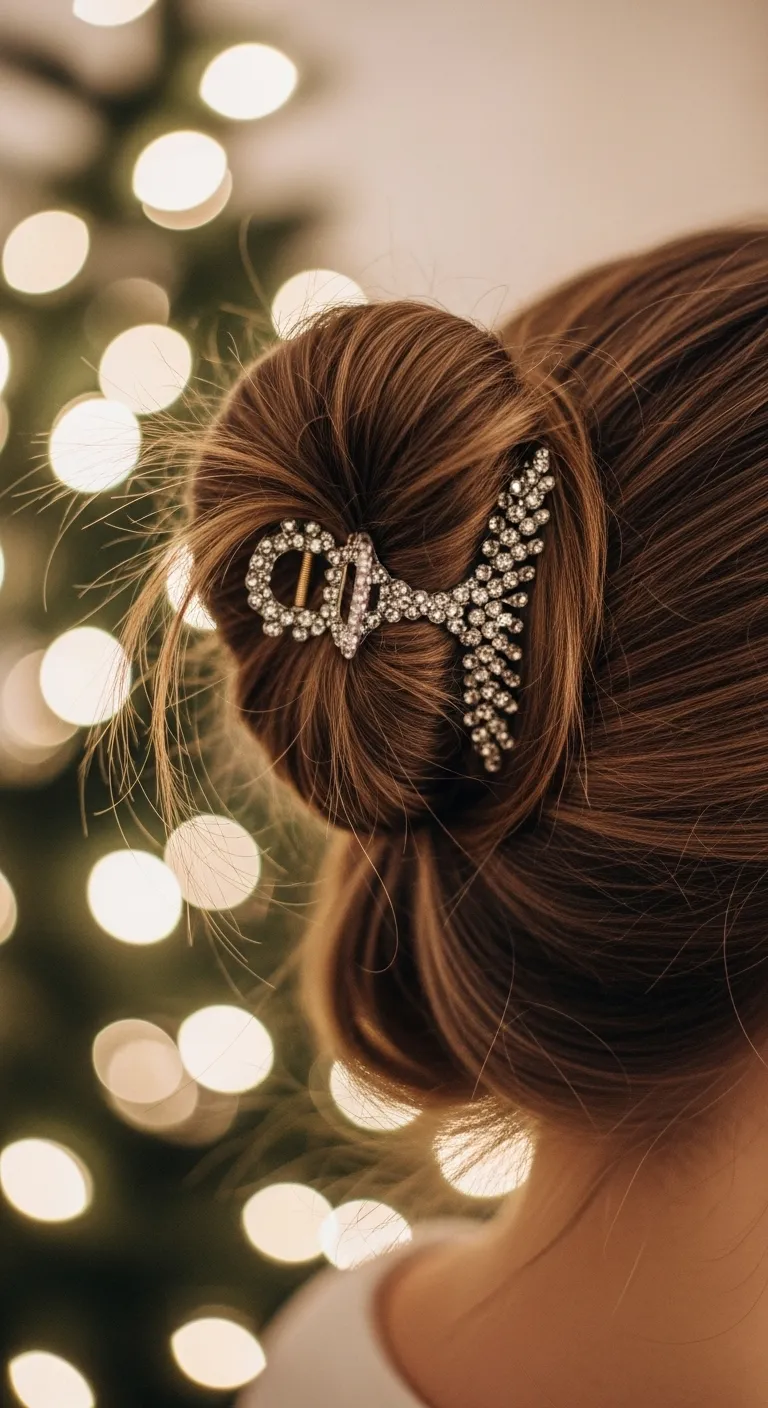 A sleek bun feels calm and tidy. Brush your hair smooth, pull it into a mid or low pony, and twist it into a firm bun. Add one glitter pin or barrette on the side. This tiny detail gives it a Christmas touch without going overboard. A small amount of gel helps keep flyaways down. You don’t need heat or extra tools—just patience for a clean brush-through. This is great for work parties because it stays neat for hours. It also pairs well with bold lipstick or sparkly tops.