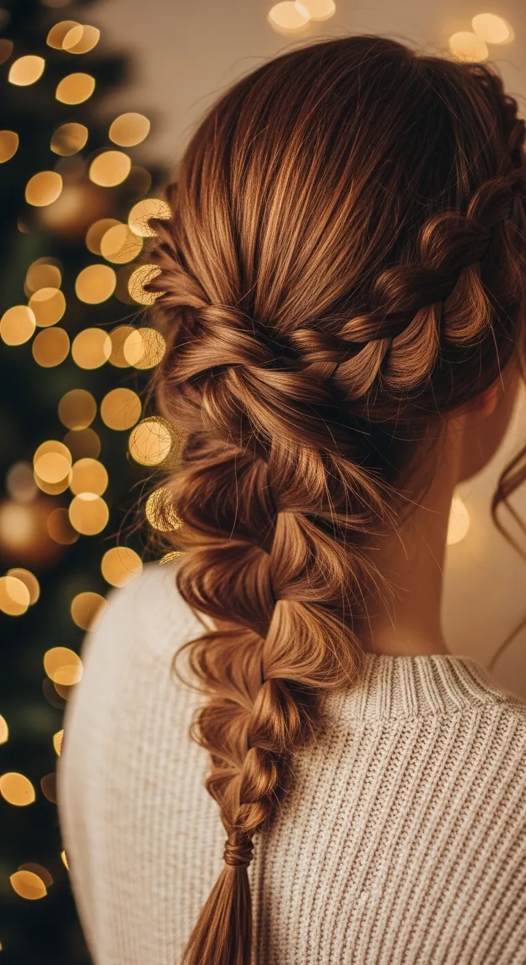 A half-up twisted crown adds a gentle festive touch without taking long. Take two thin sections from each side of your head, twist them backward, and pin them together. Use bobby pins that match your hair shade so they blend in. This works even on unwashed hair because twists hide uneven texture. You can curl the ends if you want added shape, but it’s optional. For a budget trick, use one decorative pin instead of two plain ones. It creates a small accent without spending much. This style sits well through movement and helps keep hair out of your face when opening gifts, cooking, or meeting guests. It also pairs nicely with sweaters and sparkly accessories.