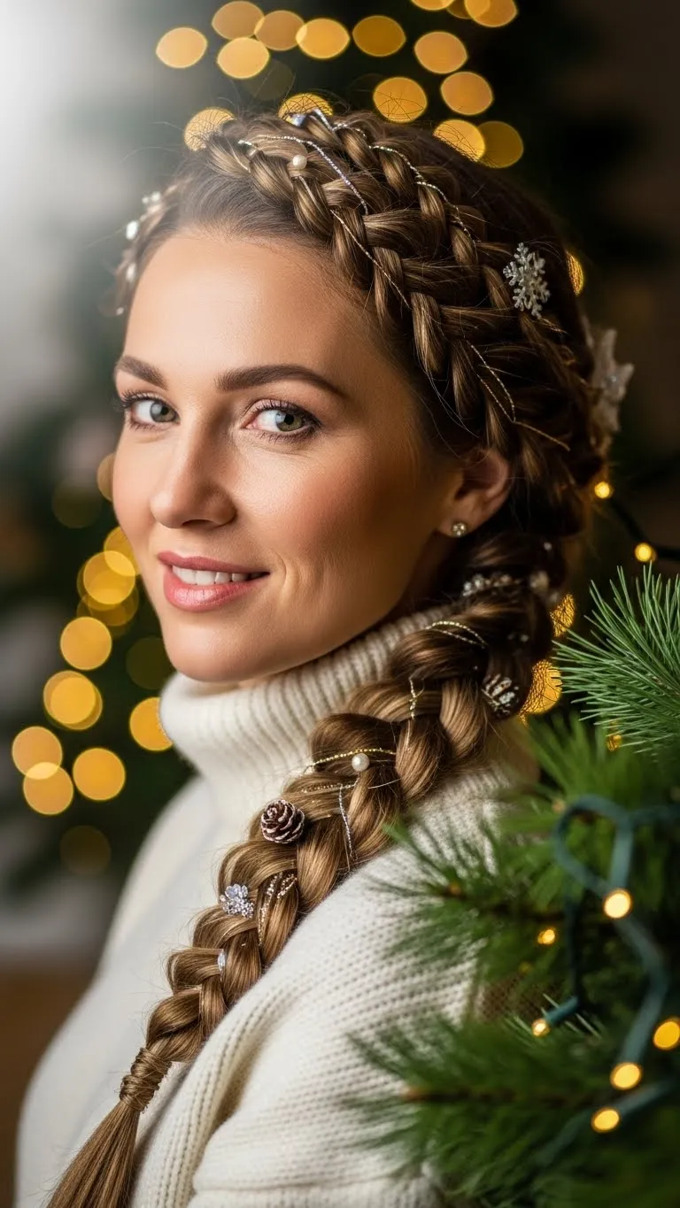Add a touch of winter greenery to your look. Make two thin braids near your temples and secure them behind your ears. Add miniature evergreen pins shaped like tiny fir branches. They’re inexpensive and easy to attach. Keep the braids soft for a natural effect. This style works beautifully with straight or curled hair. If your hair is thick, tuck the ends under for a clean finish. It’s ideal for cozy home gatherings or outdoor Christmas markets.