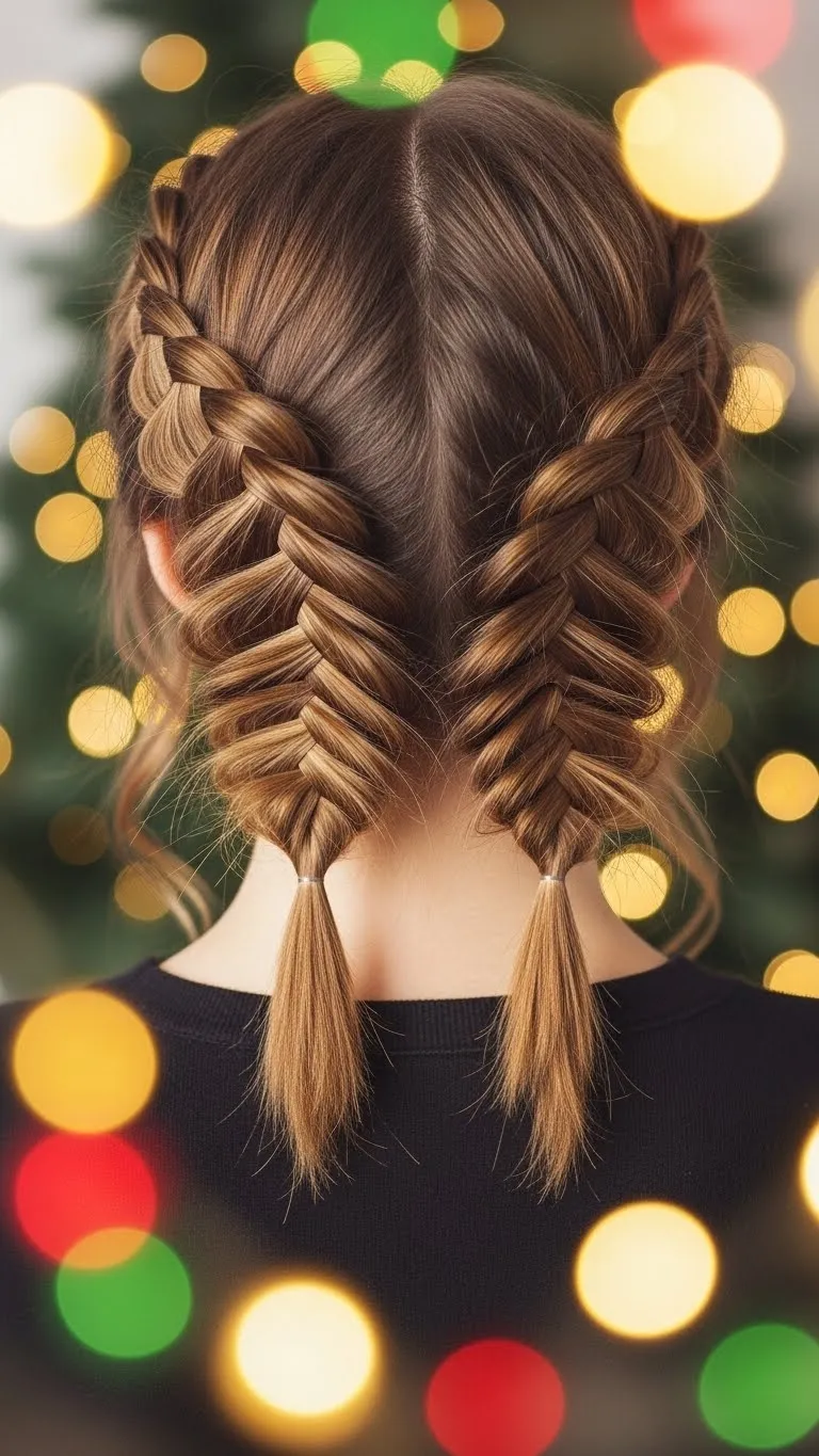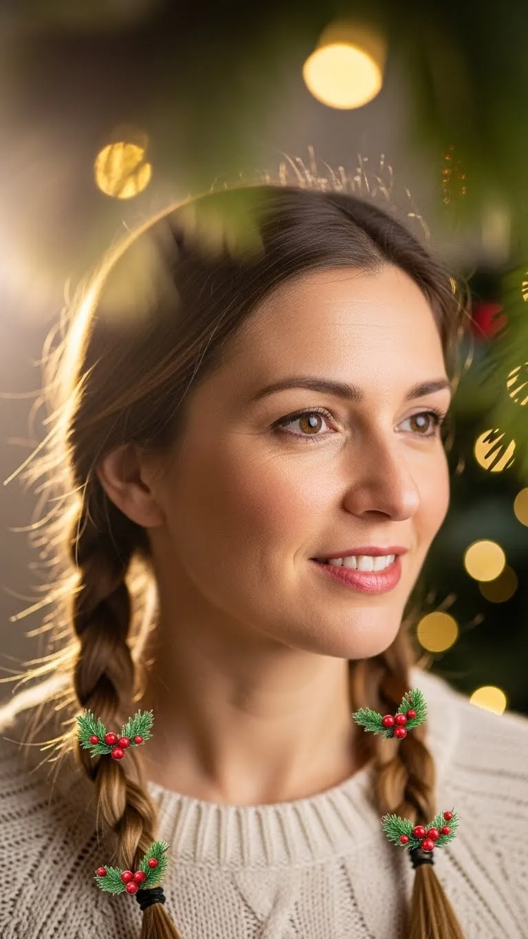 Make two small side braids and tie them at the back with garland-themed clips. These clips are inexpensive and add instant holiday charm. Keep the braids loose. Let your hair fall naturally. If you want more texture, curl the bottom half lightly. This style is comfortable for all-day wear. It also looks sweet on kids. Use matching bobby pins if the braids feel too loose.