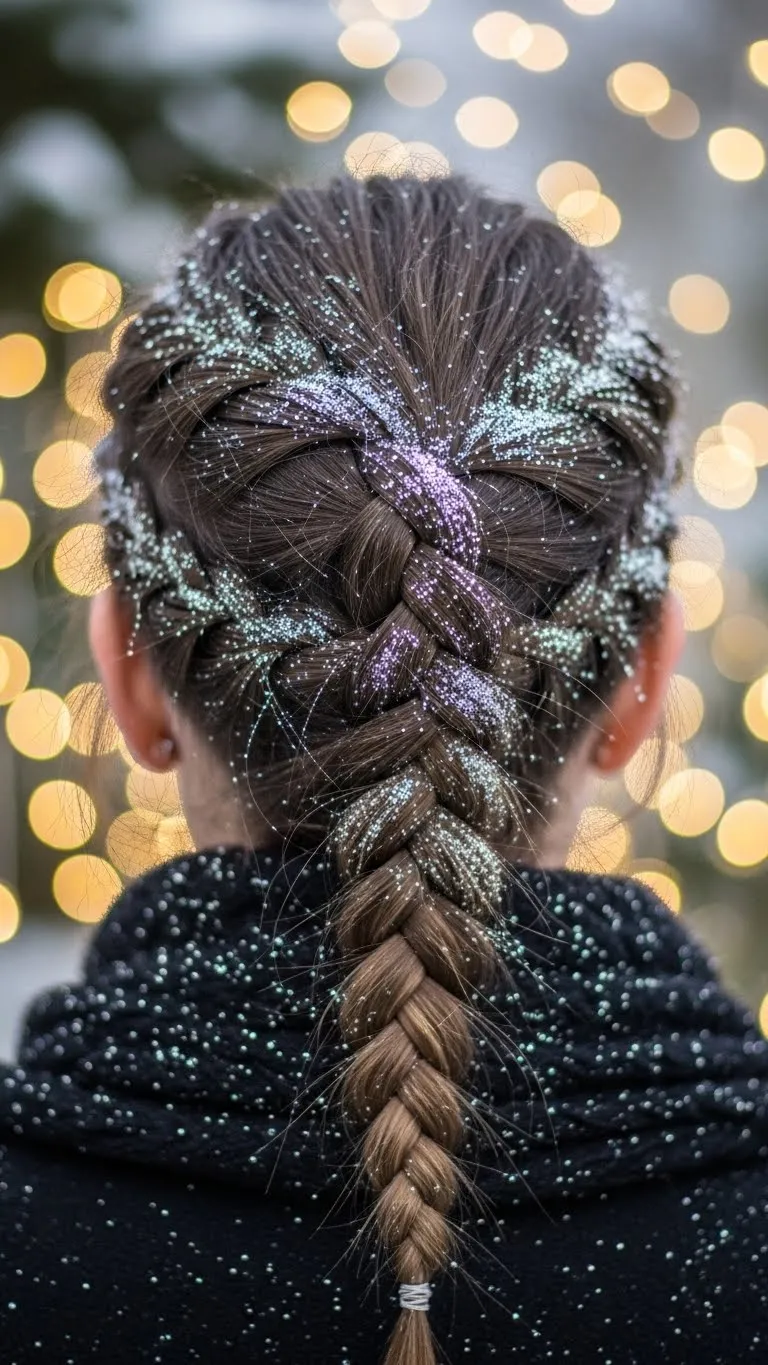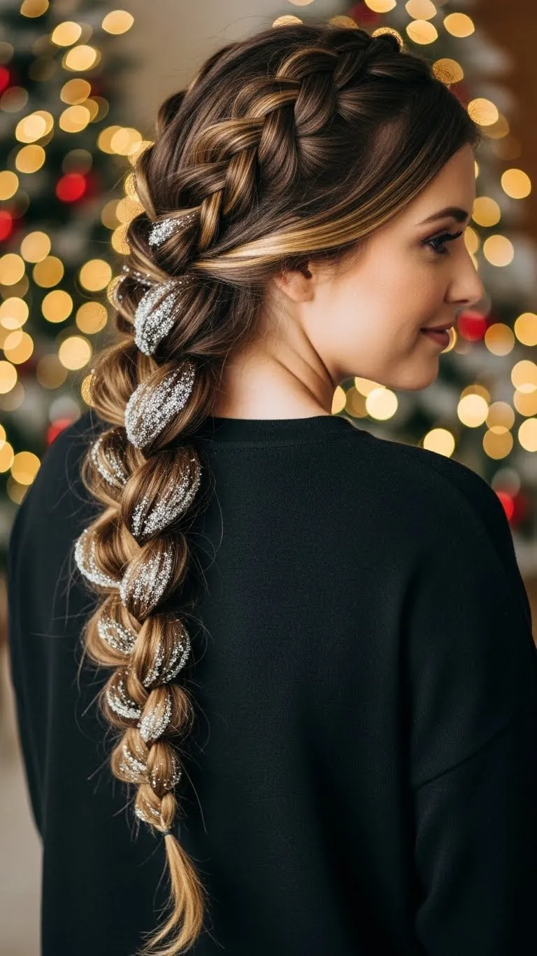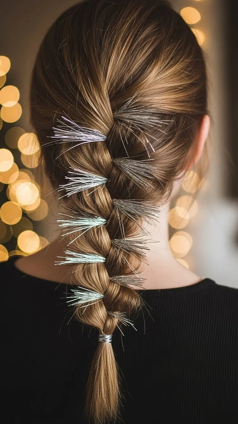 Add tinsel strands into your braid for a subtle shimmer. Choose lightweight tinsel so the style stays comfortable. Weave it through the braid from top to bottom. Secure with a small elastic. Tinsel accessory packs are cheap and last through many uses. This style suits parties, photos, or evening plans. Keep the braid slightly loose so the tinsel shows clearly. If your hair is short, create a smaller half-up tinsel braid.