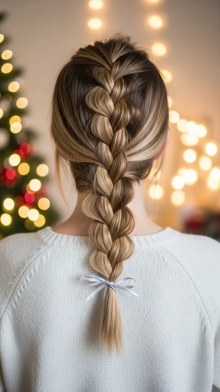 Weave a thin ribbon through a lace braid and pull it back gently. Tie it with a small bow. Lace braids look layered and soft. The ribbon adds color without needing many accessories. Use satin ribbon—it’s inexpensive and easy to match with holiday outfits. This style stays light and comfortable. Works well for medium or long hair. If your hair is fine, add a touch of dry shampoo for grip.