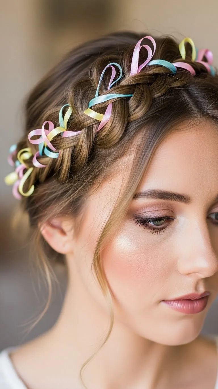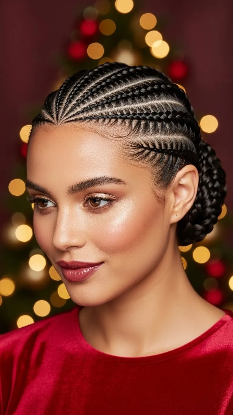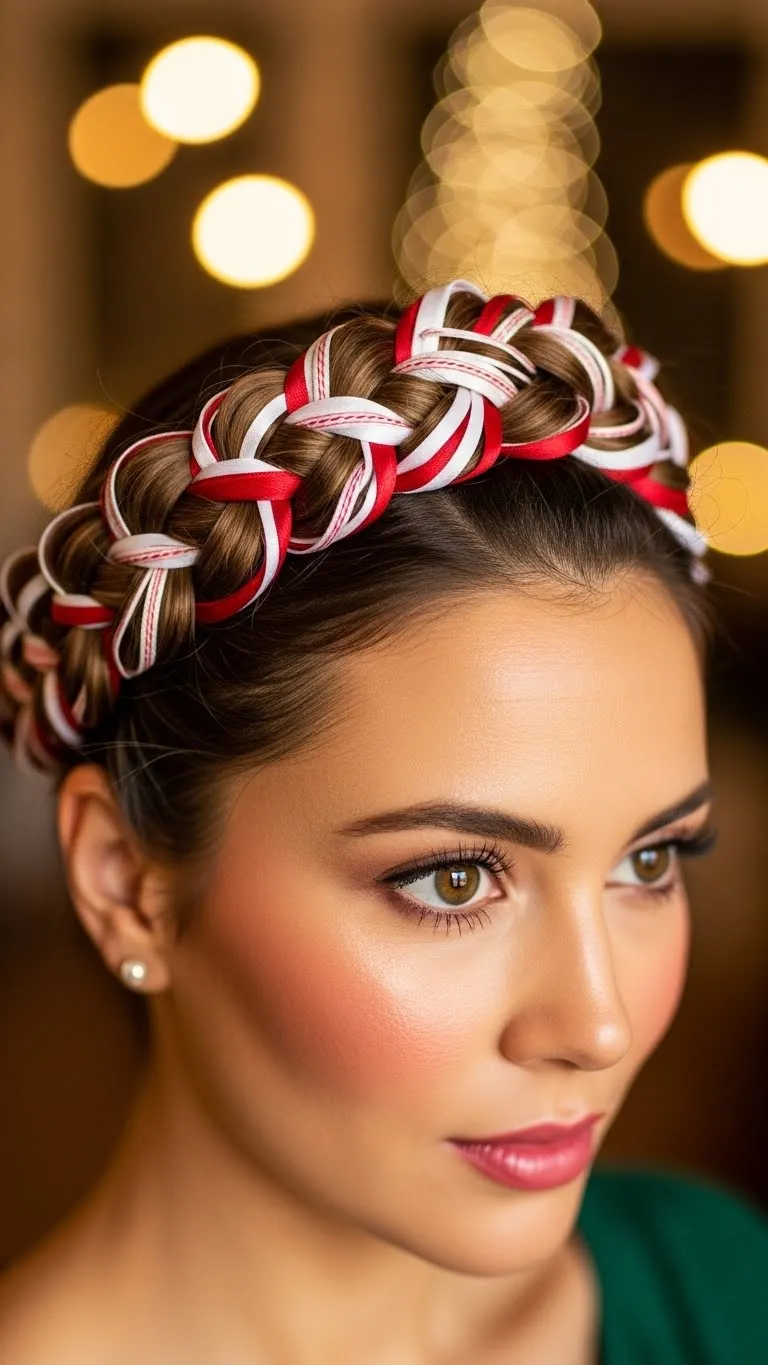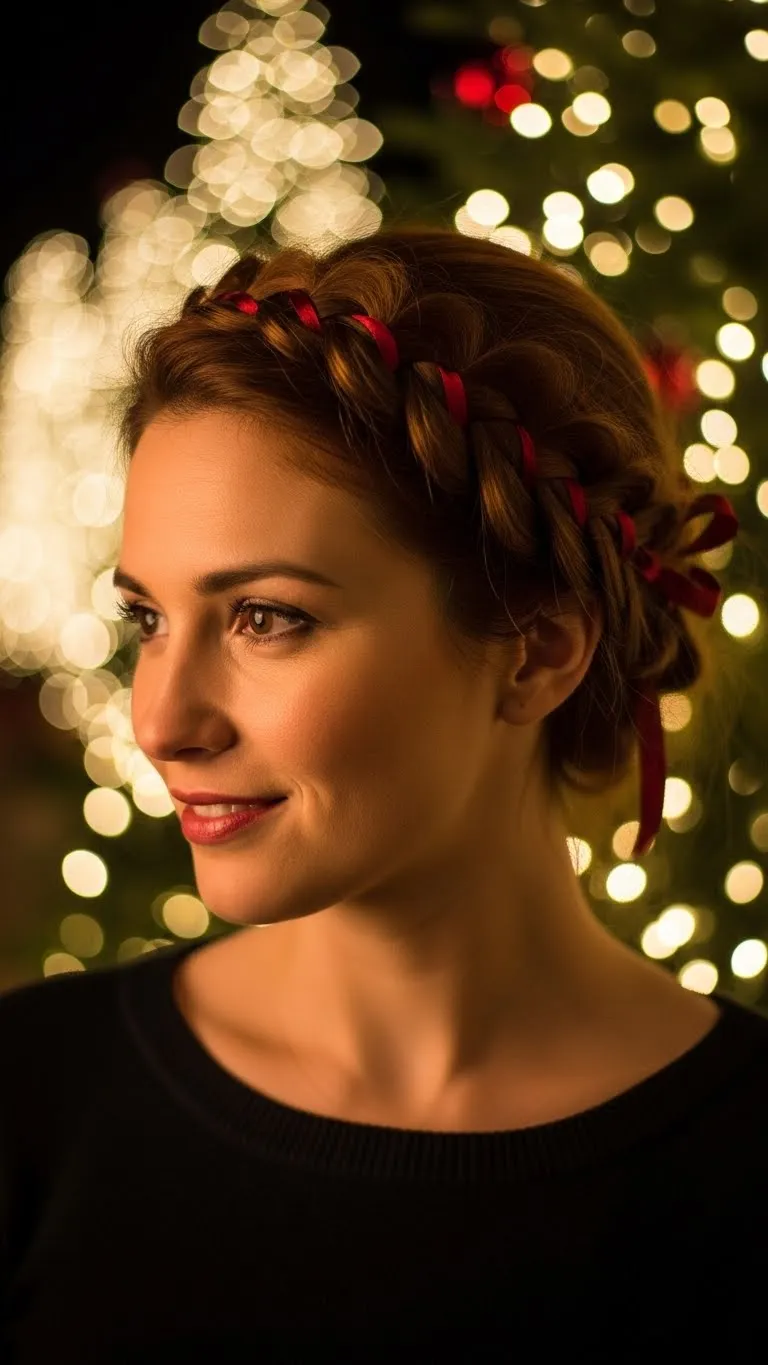 Create a halo braid and weave little ribbon loops through the outer edges. Choose soft satin ribbon in red, gold, or green. Satin ribbon is cheap and lasts all season. Keep the braid relaxed to avoid tightness. The ribbon loops add a gentle holiday charm without feeling heavy. This style works for long events and keeps hair away from your face. If your hair is short, make two braids and wrap them across the top. It’s lovely for church services, dinners, or winter outings.