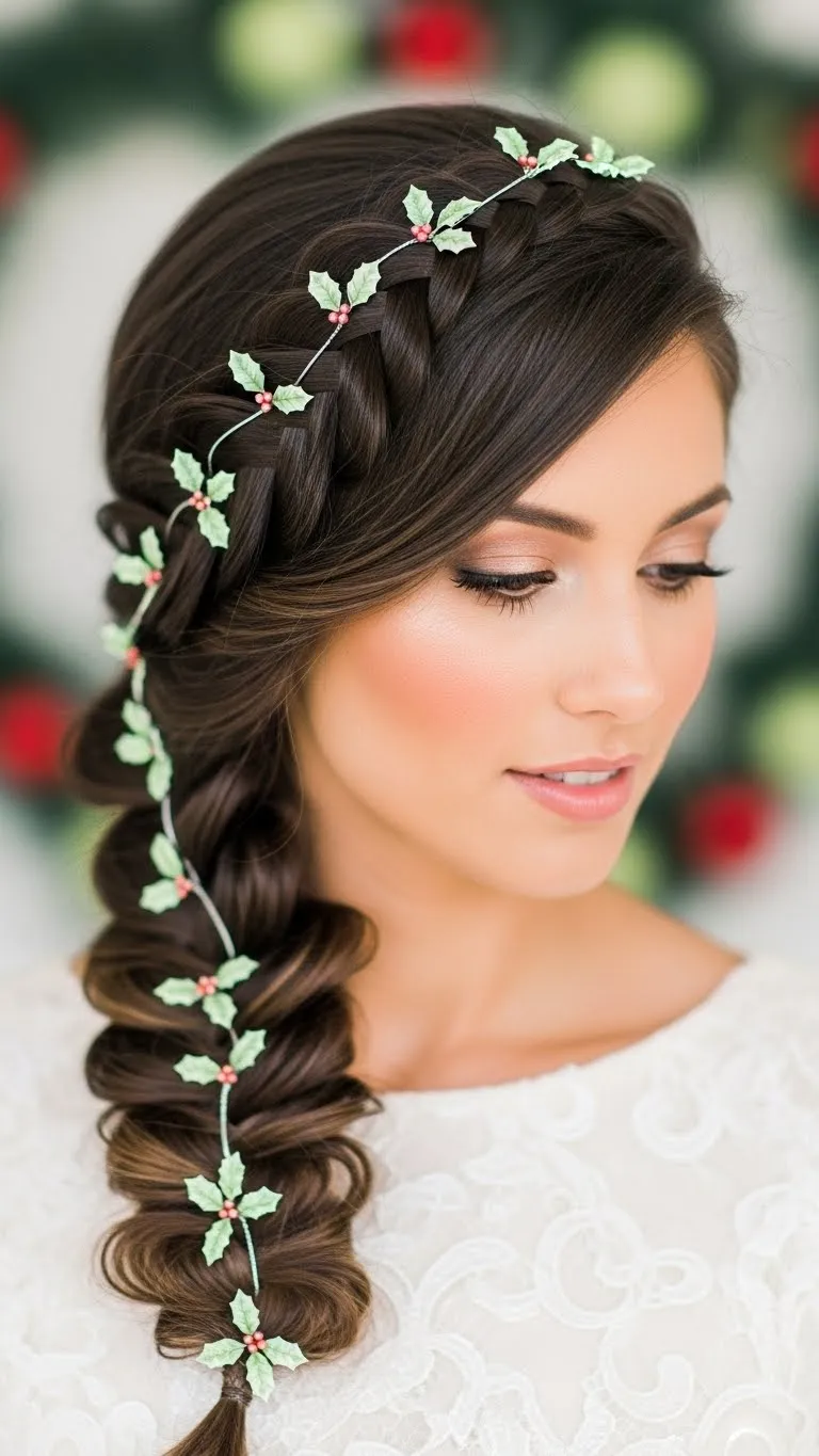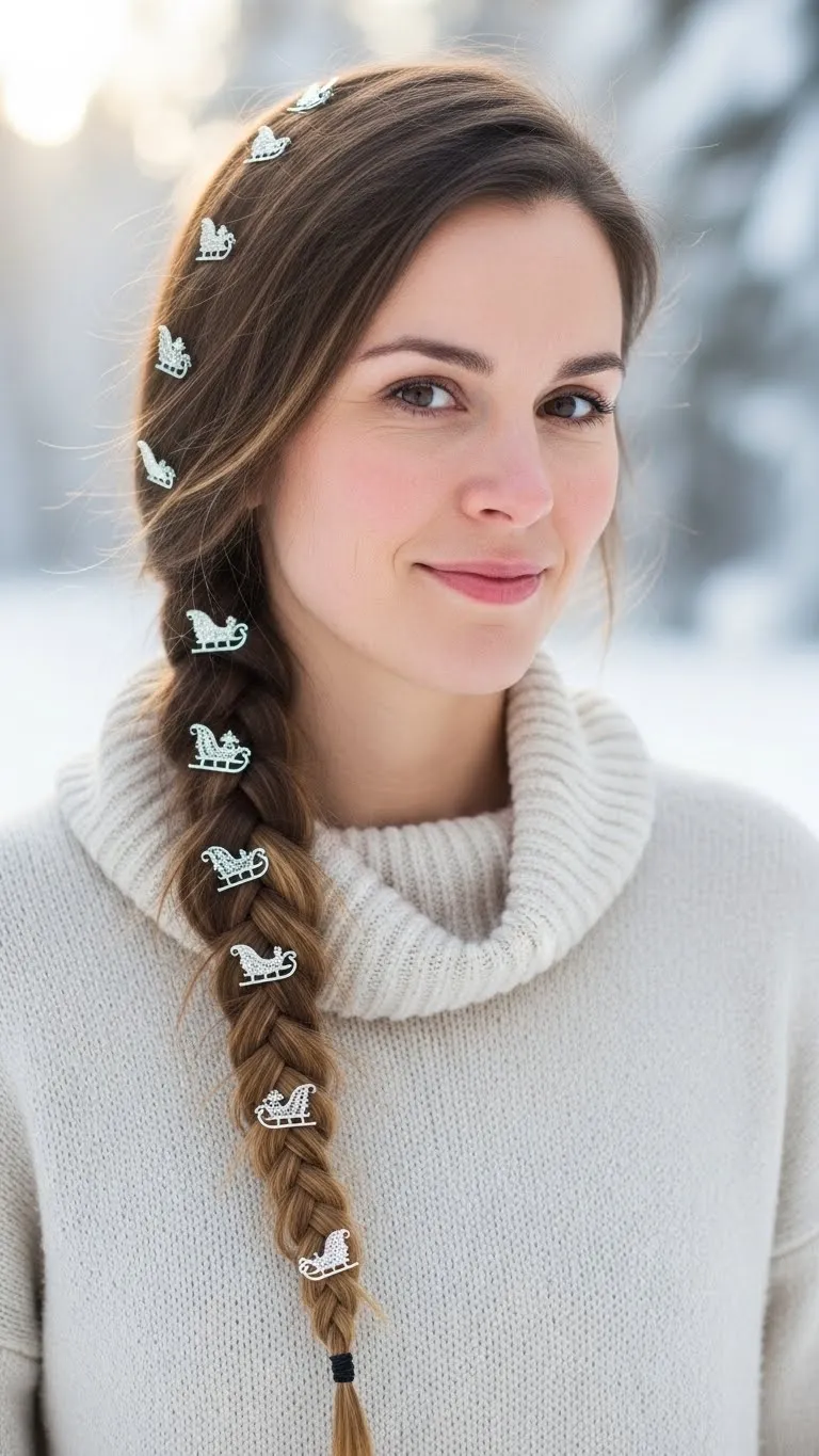 This braid feels gentle and holiday-friendly. Part your hair on one side and braid downward, keeping your braid close to the cheek. Add small holly-themed clips along the braid in a vine pattern. Affordable multi-packs are easy to find. Keep the braid slightly loose for softness. If your hair slips, apply a bit of texturizing powder. You can tuck the end under your hair with a bobby pin for a cleaner finish. This style looks lovely for dinners or casual gatherings.