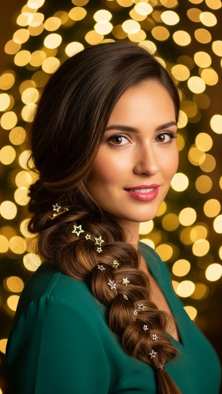 This braid feels dreamy for Christmas nights. Make a loose three-strand braid on one side. Add small star clips along one edge in a downward line. Keep the braid airy by gently pulling the sides. Star clips are cheap and often sold in packs. Use gold or silver depending on your outfit. This style suits medium to long hair. If your hair is short, make a braided half-up version. It pairs well with soft makeup and cozy sweaters.