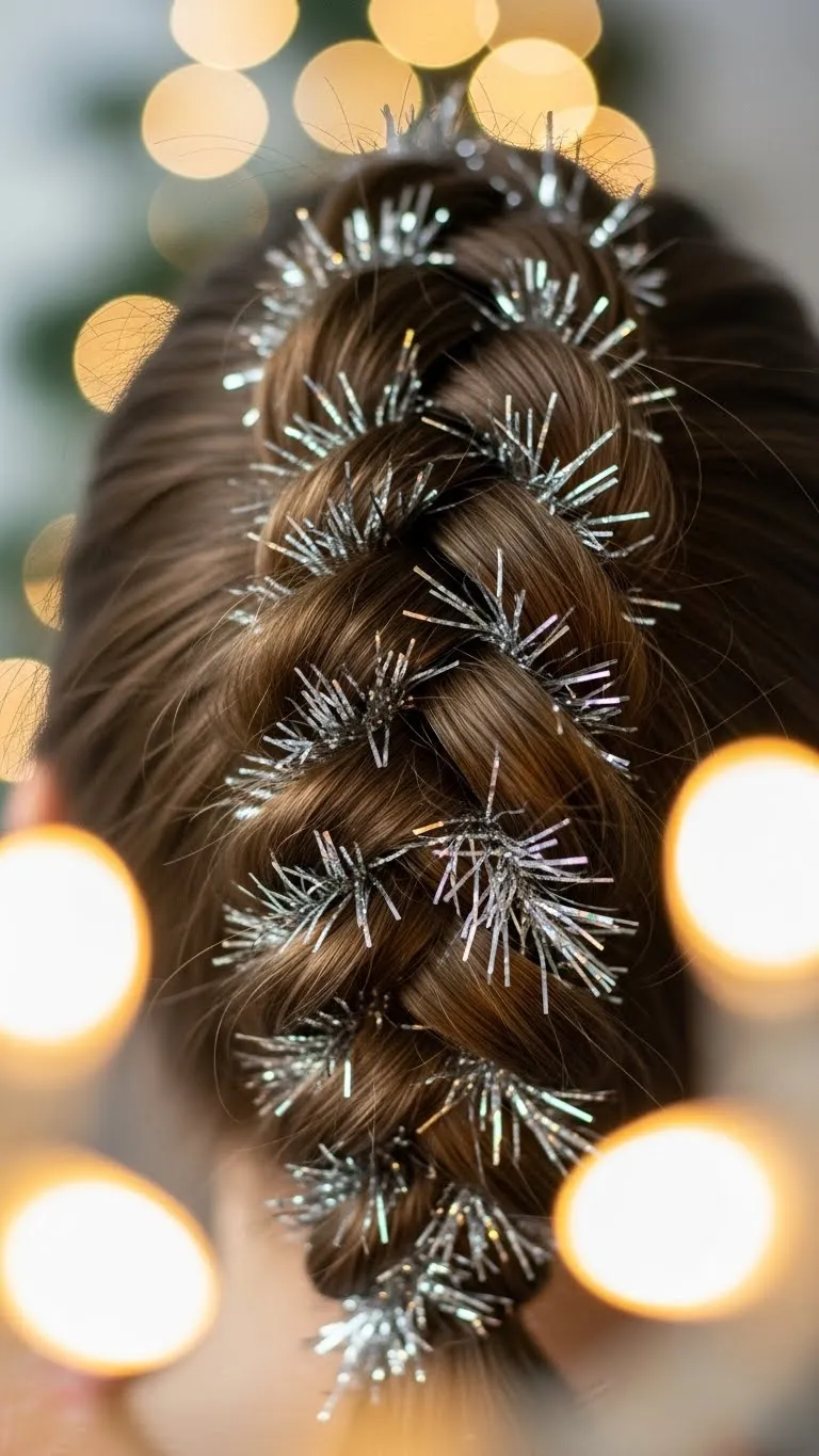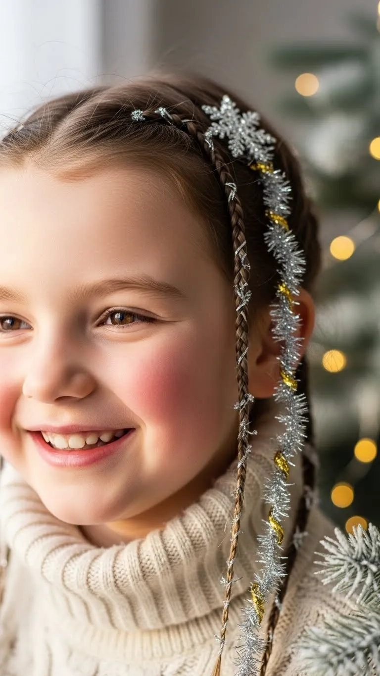 Tinsel Twists bring a soft shimmer. Take small sections and twist them gently. Insert thin strands of hair tinsel near the base using tiny silicone beads or simple clips. The tinsel is light and safe when applied softly. You can find it in multipacks that cost very little. Kids enjoy the sparkle because it catches the light. This style works on straight or curly hair. For a playful look, twist only a few pieces so it doesn’t feel heavy. If your child moves a lot, secure the tinsel closer to the root so it stays put. Add a touch of leave-in spray to calm frizz. This style is perfect for holiday outings. It brings shine without overwhelming the look.