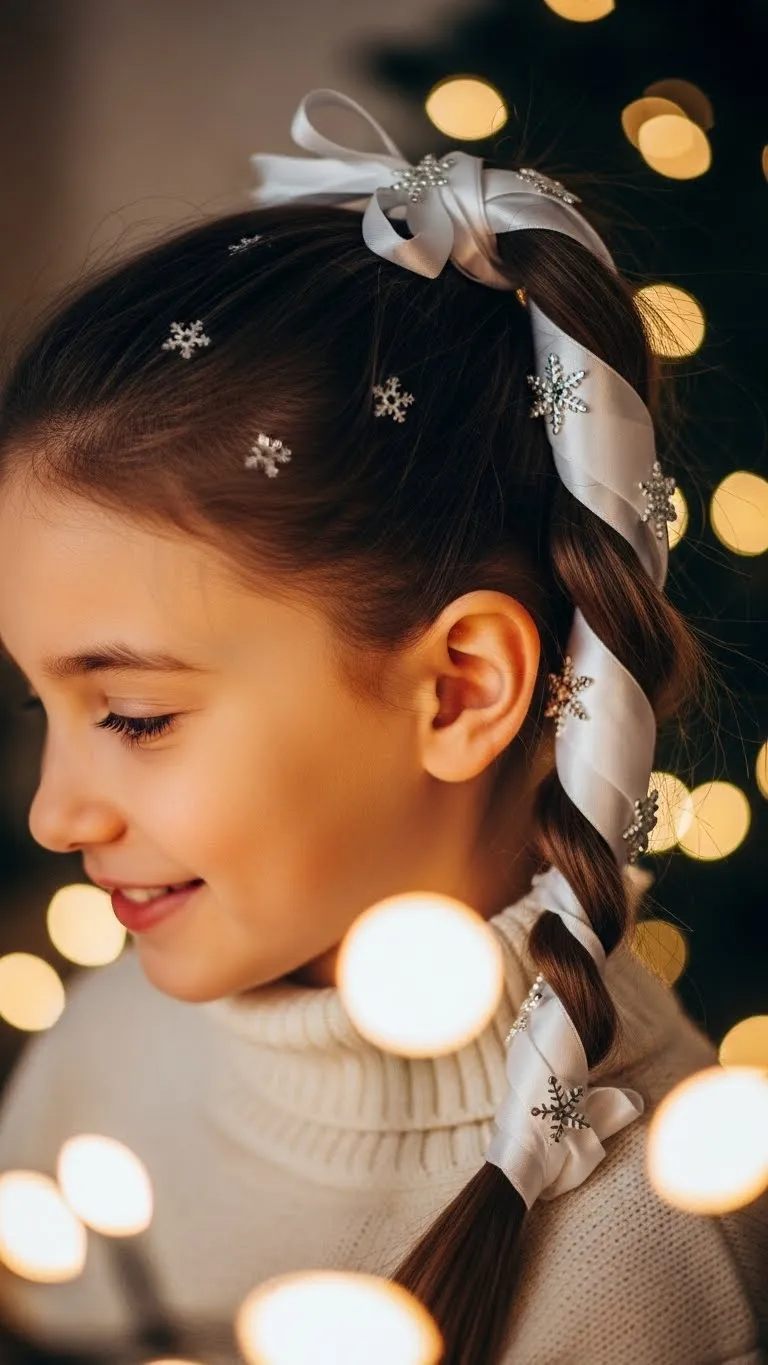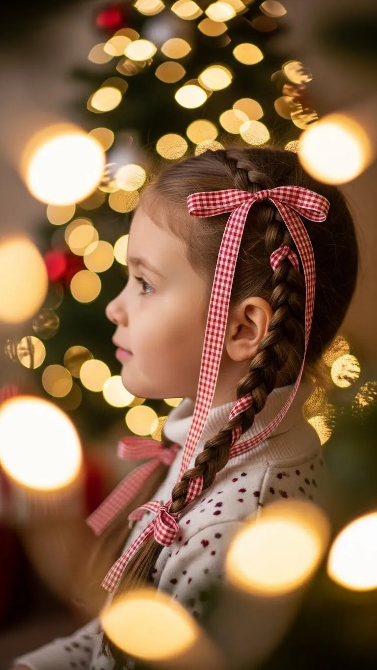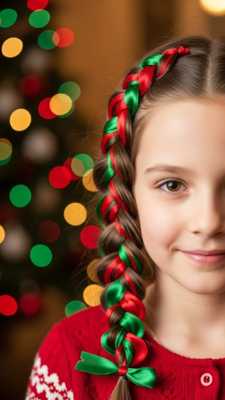 The Holly Ribbon Braid adds festive color. Make a single braid and weave holly-pattern ribbon through it. Tie the ribbon at the bottom. Kids enjoy the soft texture. Ribbon rolls are cheap and long-lasting. Keep the braid loose for comfort. This look works for school events or family photos.
