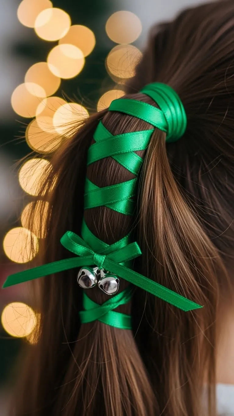 The Elf Ponytail Wrap brings a cheerful touch. Make a high ponytail. Wrap green ribbon around the base and add small bells. Choose lightweight bells so they don’t pull hair. Kids enjoy the gentle jingle. You can find these items in craft bins for a few coins. For very fine hair, wrap the ribbon onto a foam base first. This adds shape. It’s a cute pick for school or family gatherings.