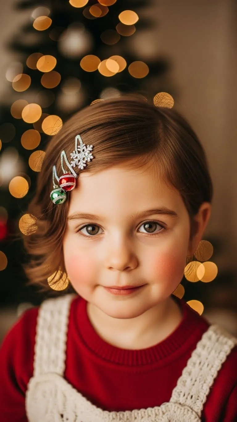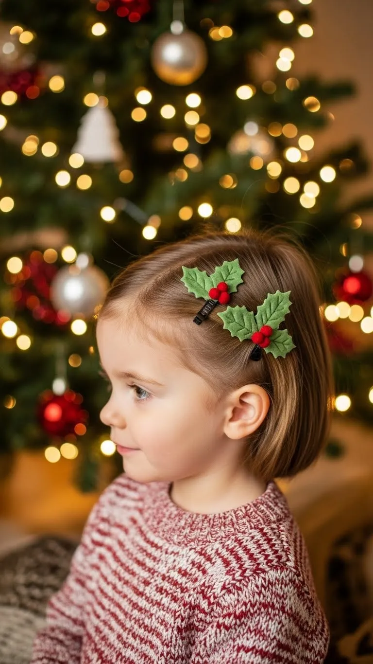 The Holly Leaf Clip Style keeps things simple. Part the hair to one side and place two holly leaf clips above the ear. They’re lightweight and comfortable. Many stores sell them in small sets. This style works on all hair lengths. Kids like the bright colors. Brush the front section gently to smooth it. Add a tiny mist of water for control. This look stays sweet and low-effort.