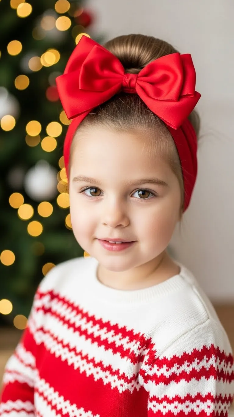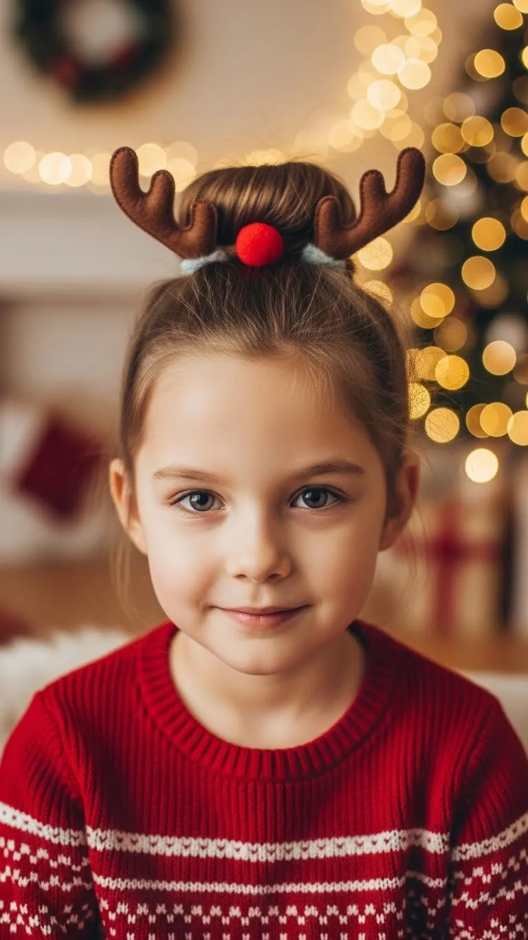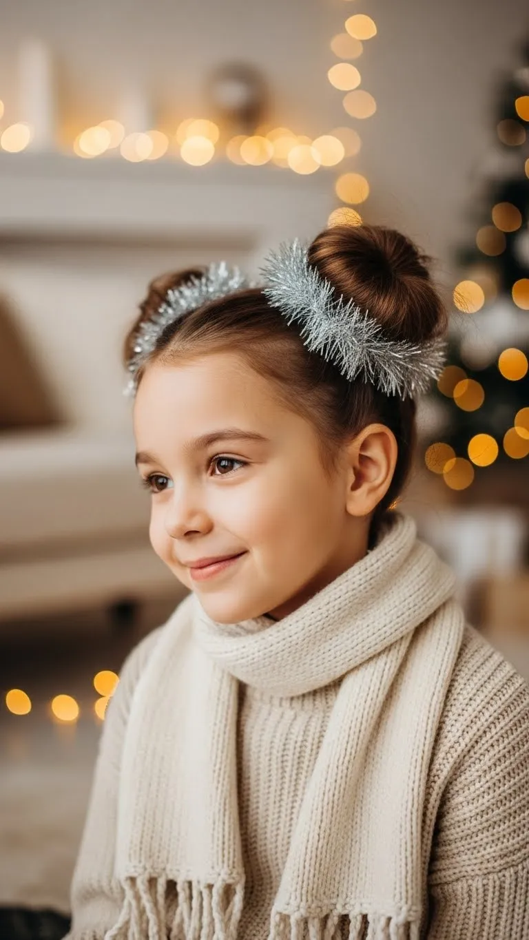 The Rudolph Bun adds playful charm without heavy effort. Make a simple top bun and keep it a bit loose so it looks soft. Slide tiny felt antlers into the sides. Add a red pom-pom in front for the “nose.” You can attach it with a small clip. This style works even if your child has thinner hair because the accessories carry most of the look. It’s affordable too. Many stores sell small felt pieces during the holiday season. If not, you can cut your own shapes from brown craft felt. Kids love this style because it looks fun but still feels light. For younger kids, use soft accessories so nothing pokes or scratches. If the bun doesn’t hold well, twist it in two smaller sections before wrapping. This gives more grip. You can finish with a mist of gentle hairspray, but only if your child is comfortable. Pair it with a red sweater for extra charm.