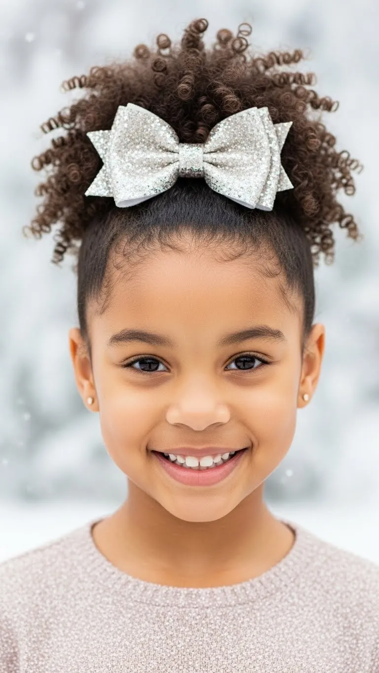 The Festive Curly Puff celebrates natural texture. Gather the hair into a puff at the crown. Add a sparkly bow for a holiday touch. Kids love the comfortable feel because nothing pulls. This works perfectly on curly or coily hair. Use a bit of cream to define curls. Bows are inexpensive and come in many shades. This style is fast and great for busy days.