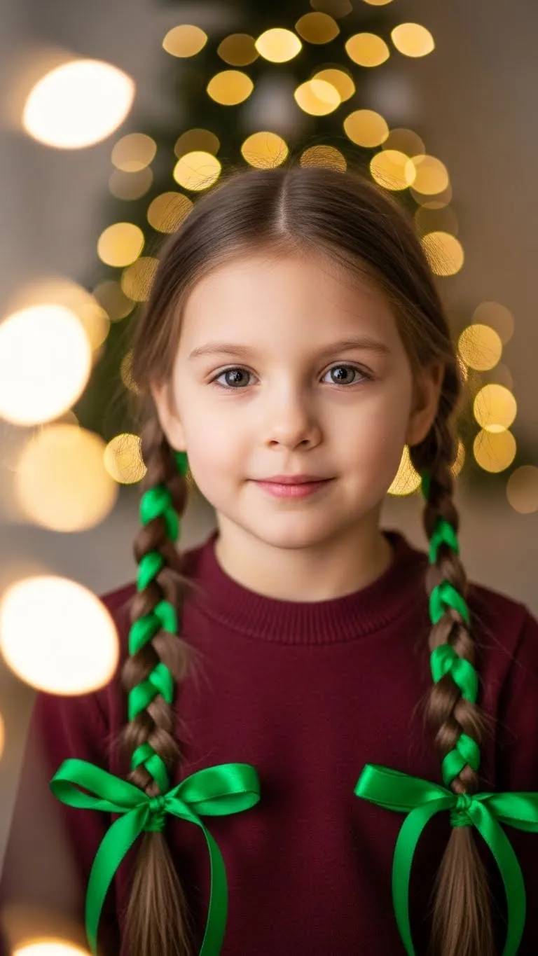 Ribbon Wrapped Braids add texture and color. Make two braids. Wrap thin green ribbon around each braid, working from top to bottom. Tie the ends softly. Kids like how smooth the ribbon feels. Craft stores sell ribbon cheaply. This style works well for long hair. Keep the braids loose for comfort. It stays neat even through busy play.