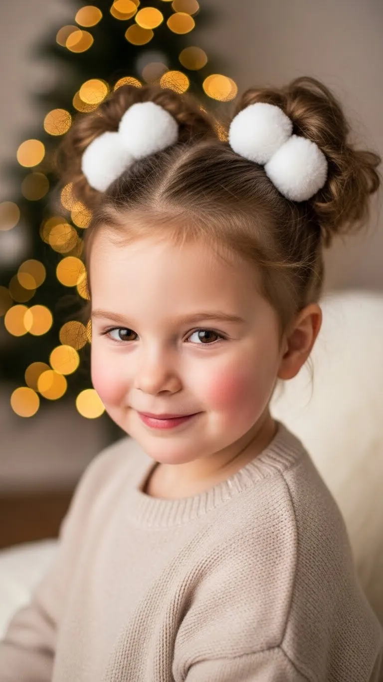 Snowy Puff Balls look playful and cozy. Create two puffs and place soft white pom-pom clips on top. Kids enjoy how fluffy they feel. These clips cost little and come in sets. This works especially well on textured hair. Use a bit of moisture cream before shaping the puffs. It keeps hair soft and easy to manage. Great for quick holiday mornings.