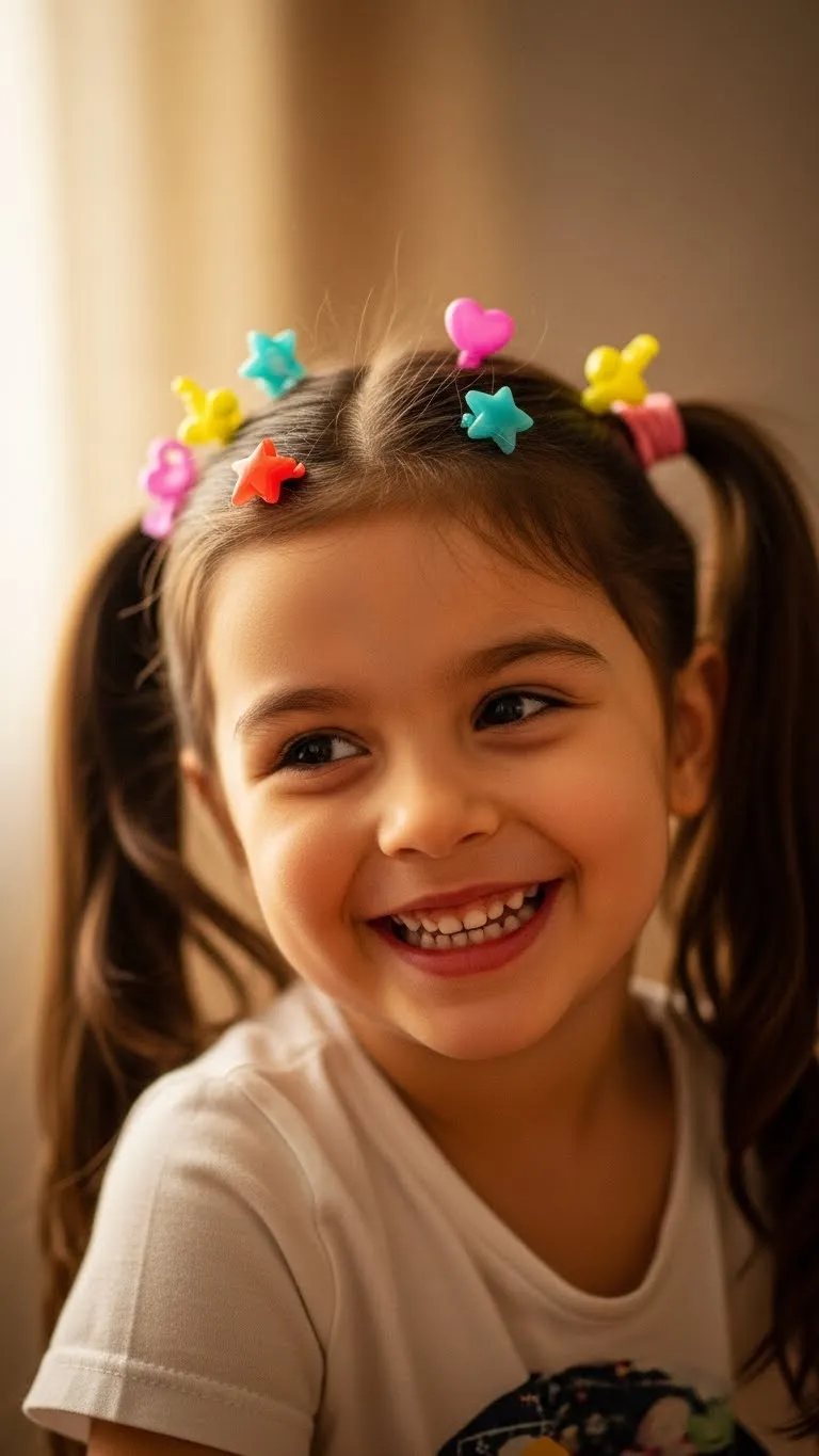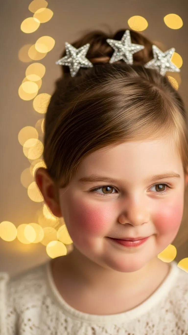 The Star Clip Half-Up style keeps things simple. Gather the top section of hair and secure it with a small elastic. Add star clips along the pulled-back section. The clips do most of the styling, so the process stays quick. This works well on short, medium, or long hair. You can find star clips at dollar stores or holiday craft bins for very little cost. If your child has curls, keep them natural. The accessories add instant charm without flattening the texture. For straighter hair, you can twist the half-up section for extra detail. Kids like this look because it’s sparkly but not heavy. The clips hold well and don’t tug. If you worry about slipping, use silicone-grip clips. They’re gentle and stay put through movement. This style is perfect for school holiday events or family dinners. It has just enough shine to feel festive without taking much time.