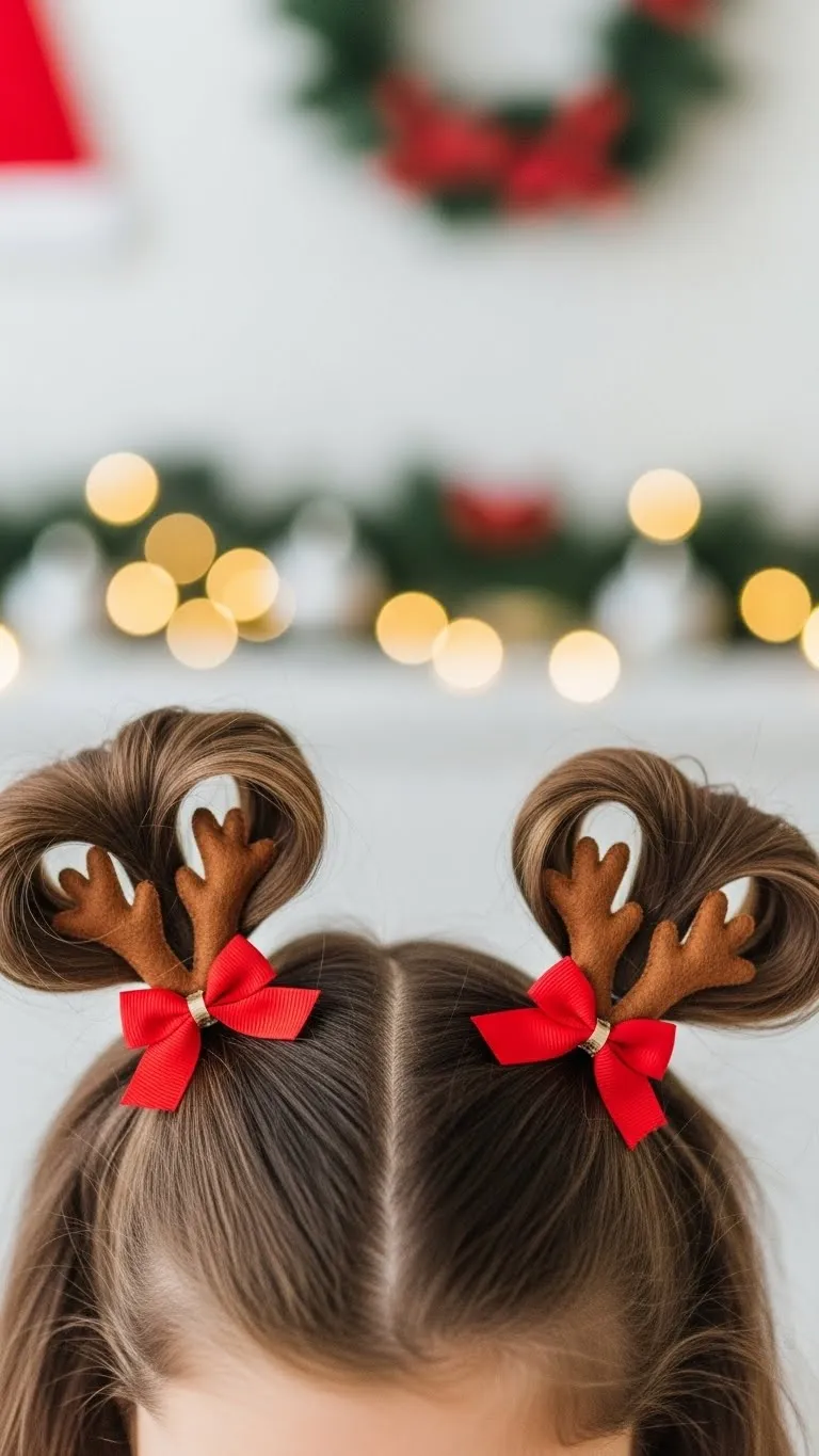 Reindeer Pigtail Loops are fun and easy. Create two pigtails and loop them upward, securing the ends under the elastic. Add small antler clips above each loop. Use a red bow at the center for charm. Kids love how the loops bounce. You can make the loops tighter for long days. Felt antlers are affordable and soft. If your child has short hair, use mini elastics to create small loops. This style stays comfortable and playful.
