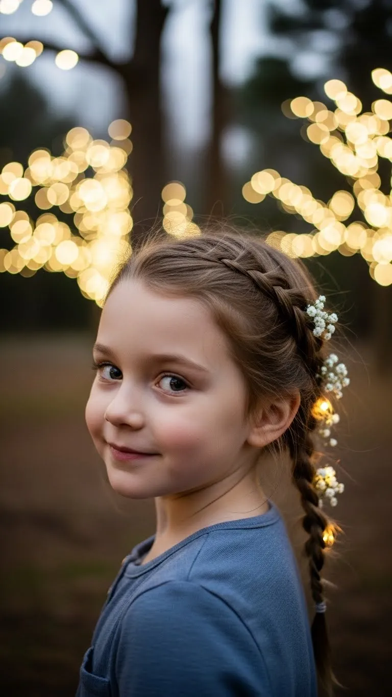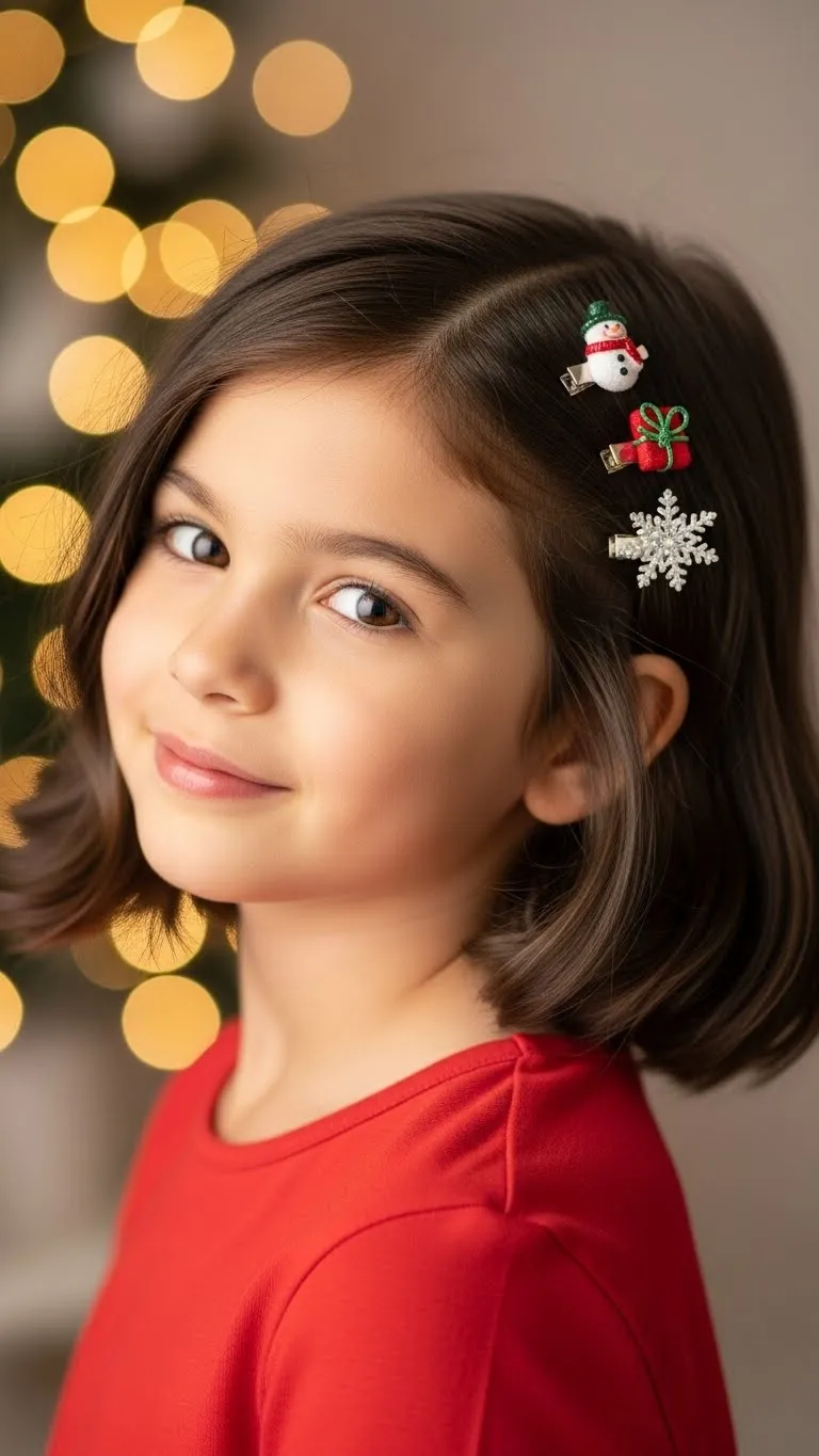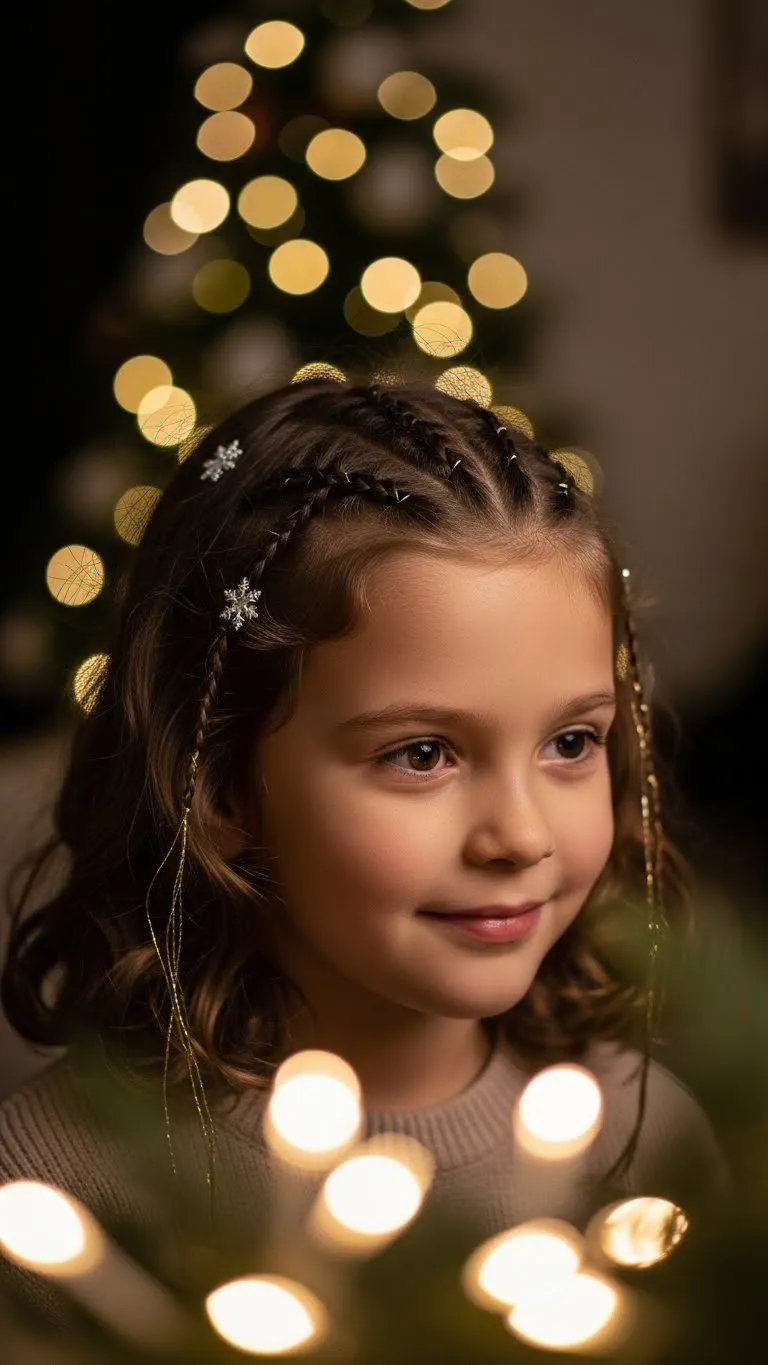 A small waterfall braid adds charm without complexity. Choose one side of the head and braid a short section, dropping small strands as you go. Clip the end with a tiny bow. This braid looks pretty with wavy or straight hair. It keeps the style light and soft. If your child has short hair, only braid a small piece near the front. You can add a sparkly clip for extra brightness. This style works well for Christmas photos or school events. Parents like how the braid stays in place throughout the day.