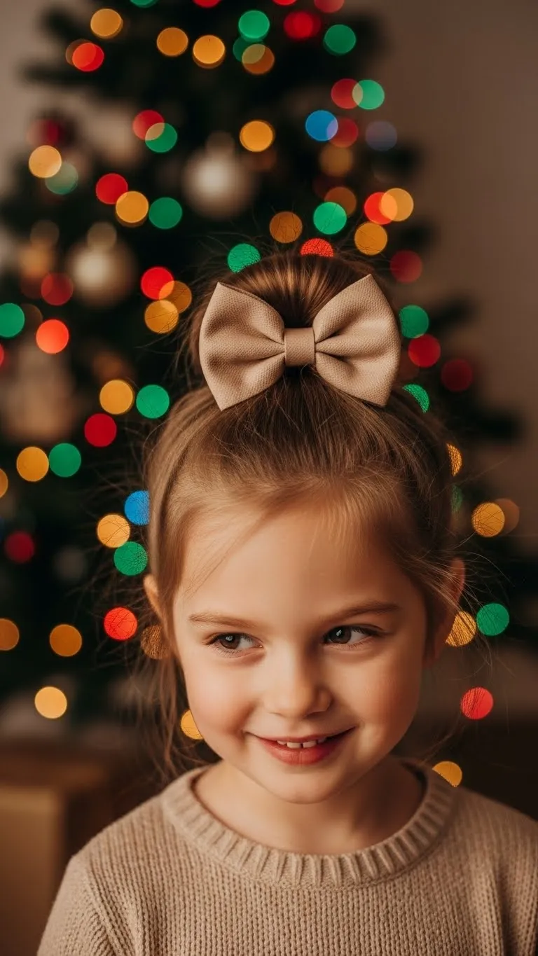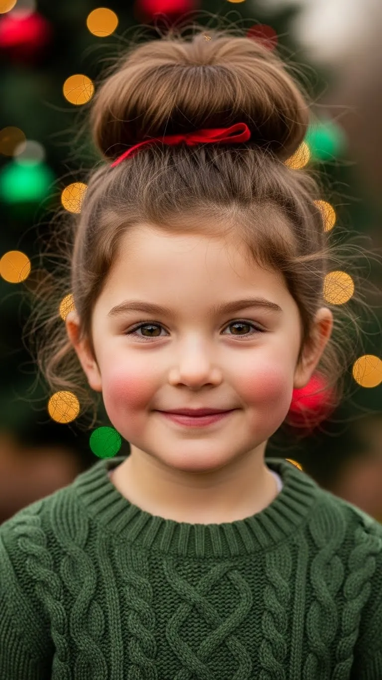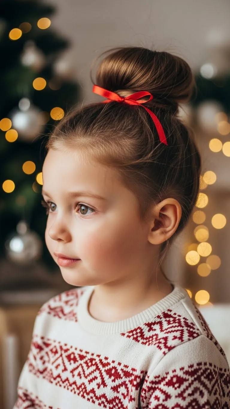 A top knot always looks cute and takes only a few minutes. Gather the hair into a high bun and wrap a ribbon around it like a gift bow. You only need a small amount of ribbon to create a festive touch. Avoid tight wrapping so it stays comfortable. You can choose any color, but red or gold makes it feel more seasonal. This style is perfect for parties or photos because it stays neat through movement. If your child has fine hair, use a scrunchie under the bun to add fullness. A light spritz of water helps smooth flyaways without buying anything fancy. This look is simple, sweet, and easy to adjust throughout the day.