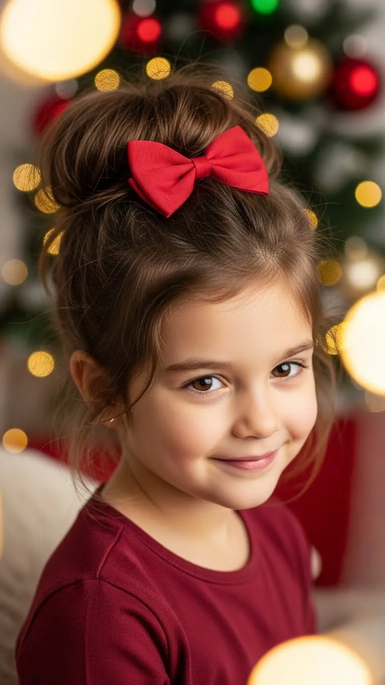 A messy bun is perfect for casual family days. Pull the hair into a loose bun and let a few strands fall naturally. Add a soft red bow at the base for a sweet holiday touch. This style requires almost no tools. It works best on medium or long hair. If the hair is fine, wrap it around itself a few times before securing. Kids love how comfy it feels. It’s also quick to redo if it loosens during play. This style is great when you want something cute with minimal effort.